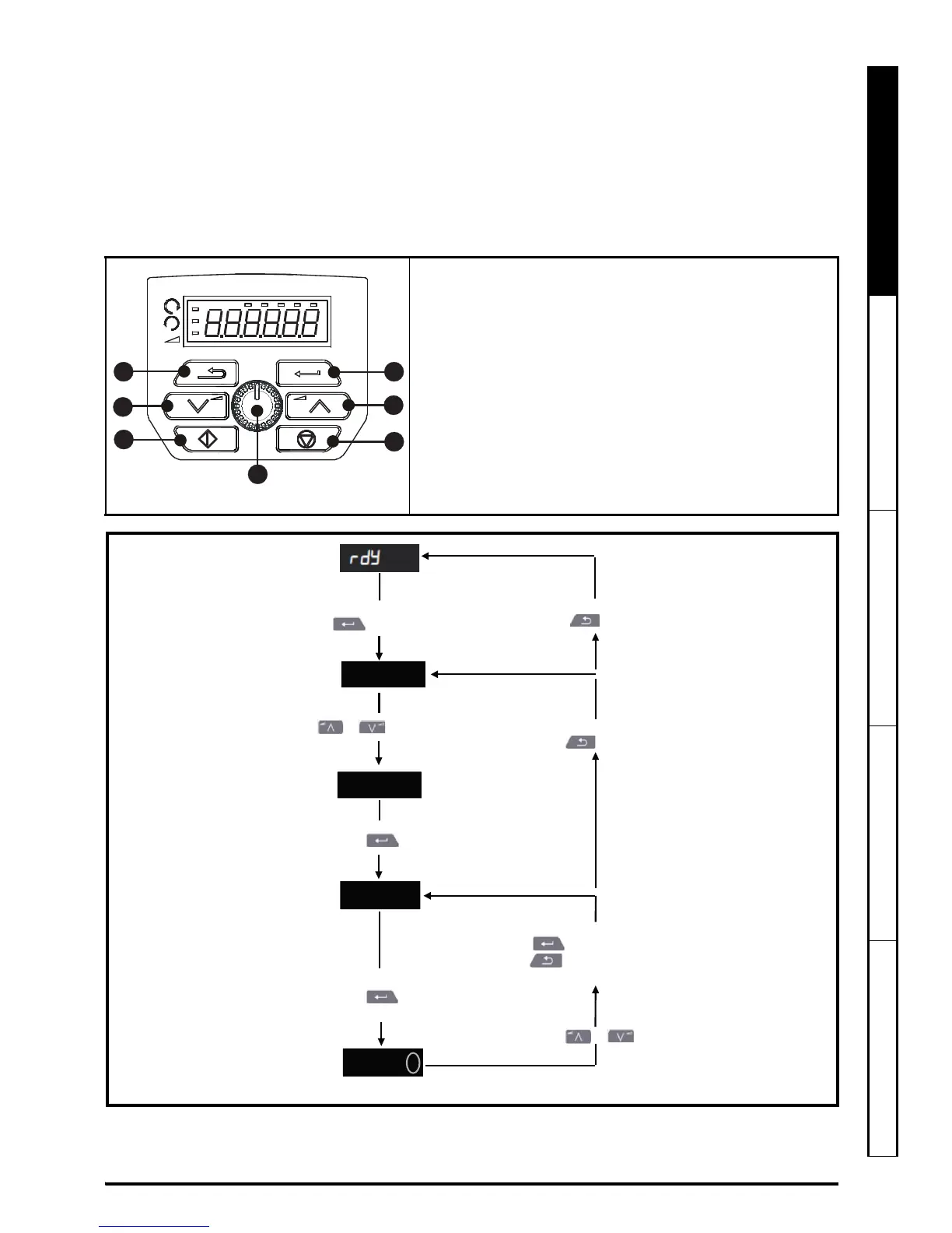The keypad provides the means for changing parameters, stopping and starting the drive, and the ability to perform