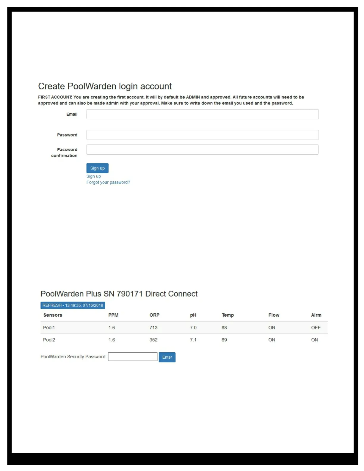 After login, a screen that shows the current measurements along with a field to enter a password. To