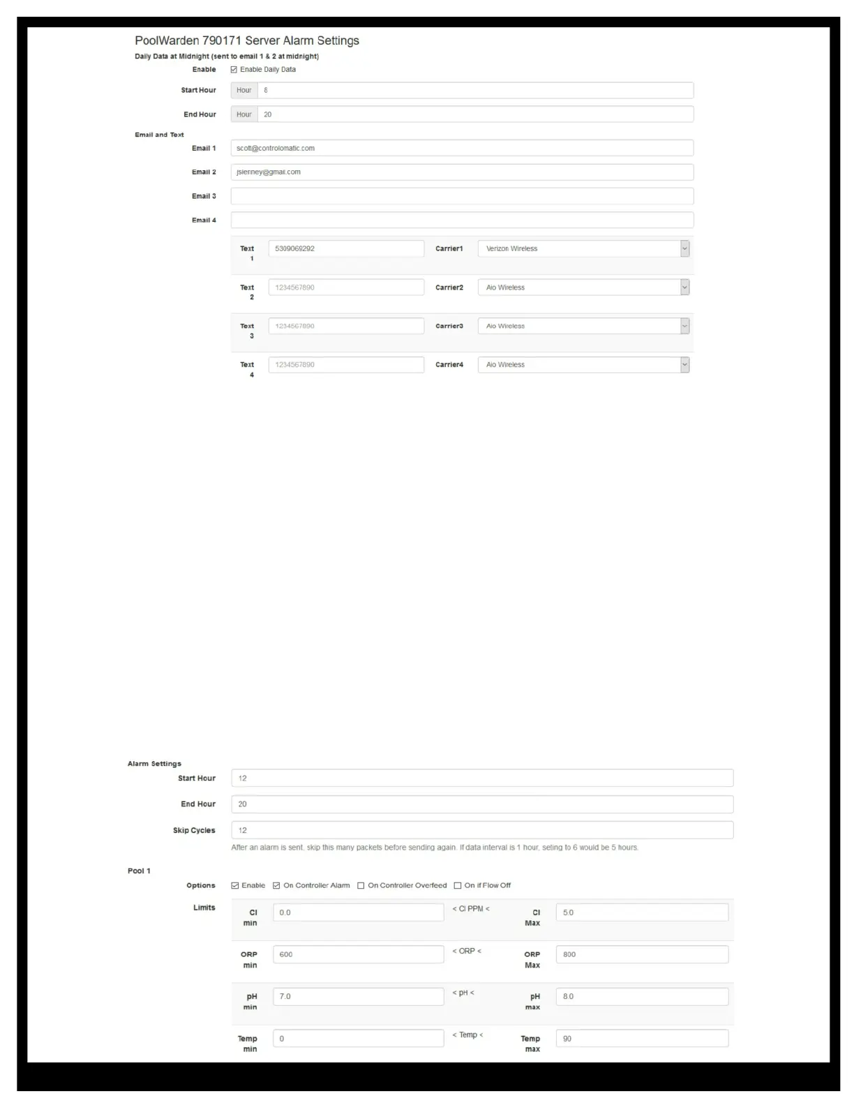 t Pool Conditions Limits: Enter alarm limits for the sensors that can be different than the alarm values