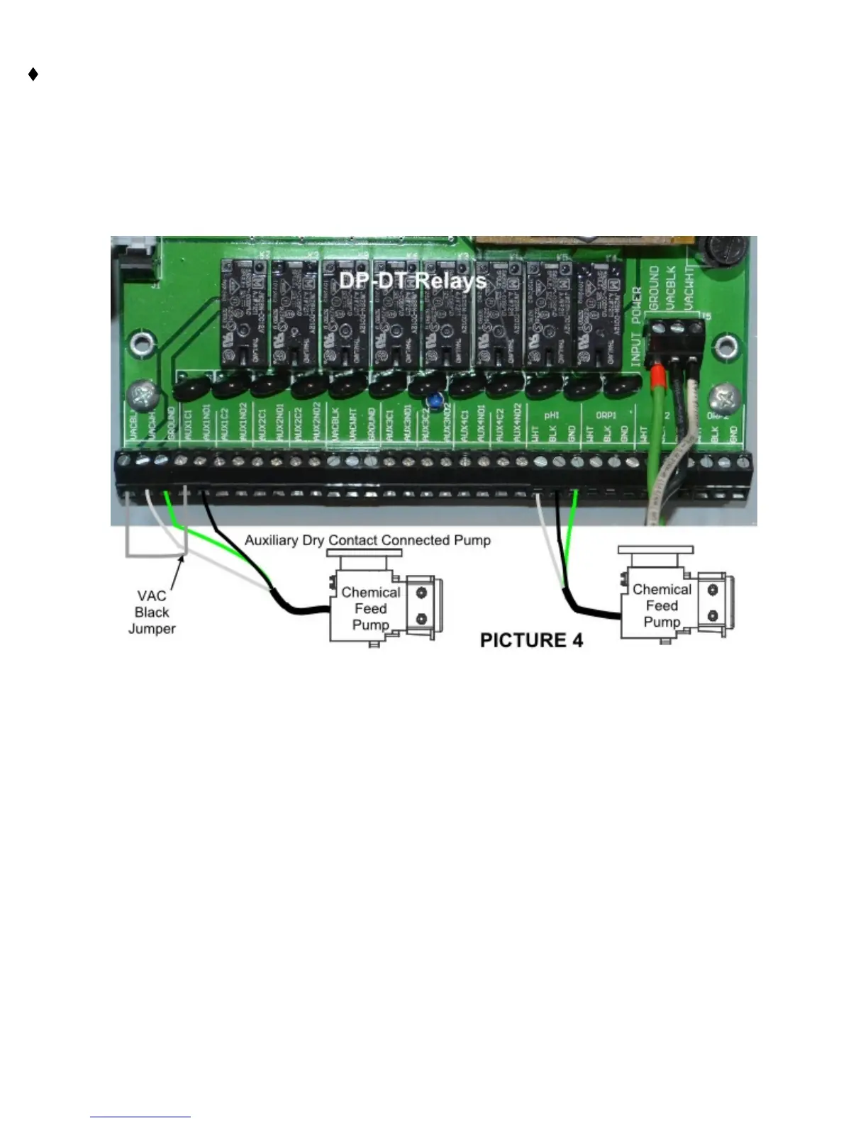 ⧫ PH / ORP BLK: For 110 connect to the black line wire on the load. For 220 connect to the other Line