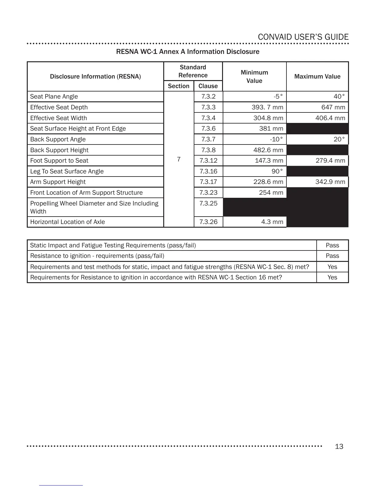 Requirements and test methods for static, impact and fatigue strengths (RESNA WC-1 Sec. 8) met? Yes