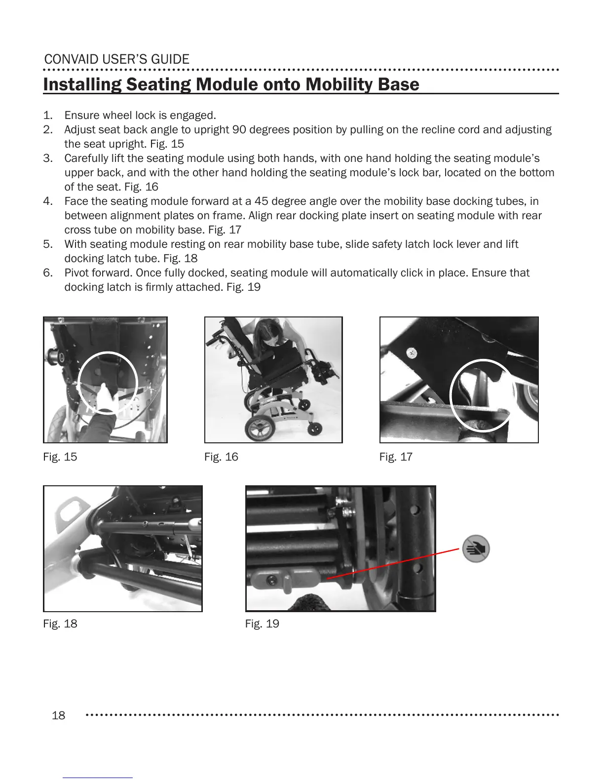6. Pivot forward. Once fully docked, seating module will automatically click in place. Ensure that