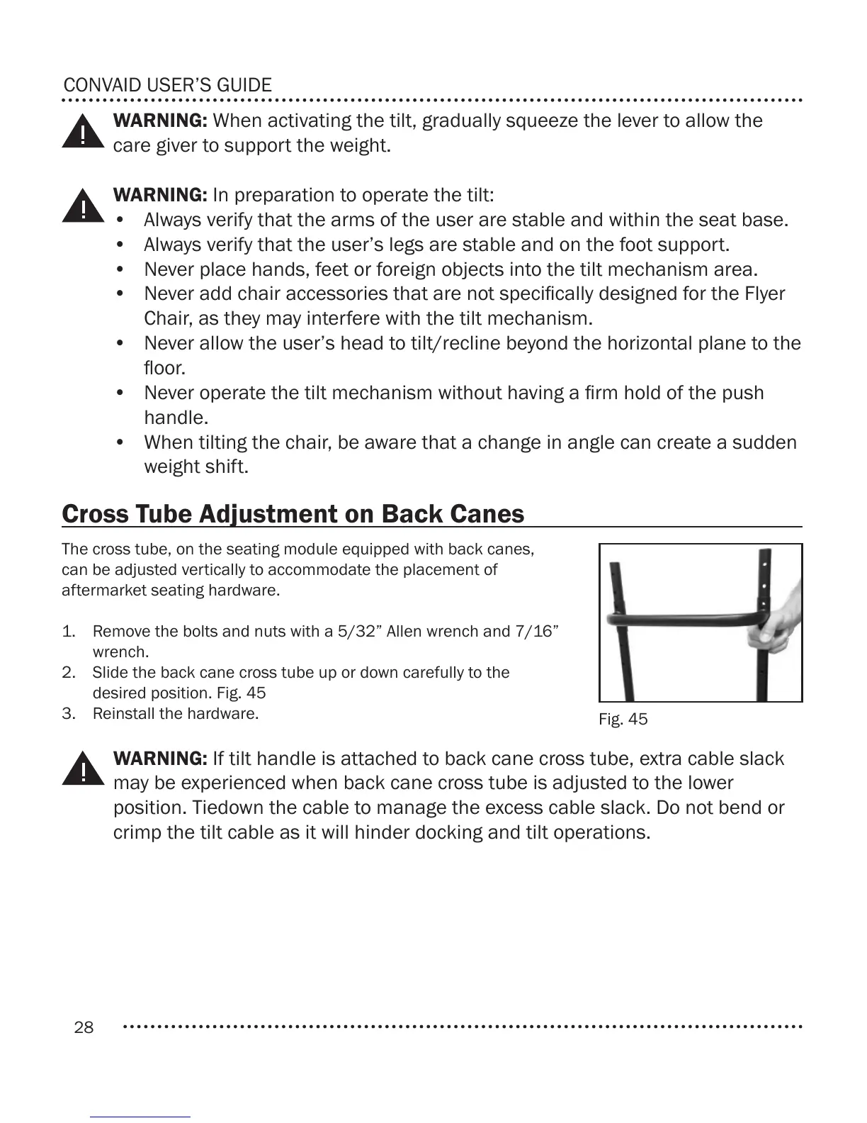 WARNING: If tilt handle is attached to back cane cross tube, extra cable slack