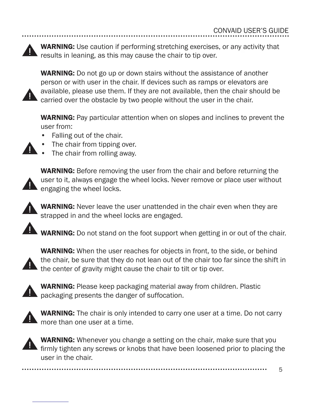 WARNING: The chair is only intended to carry one user at a time. Do not carry