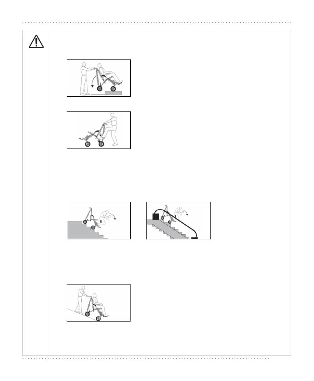 • Do not attempt to take occupied chair up or down stairs, escalators, steep inclines,