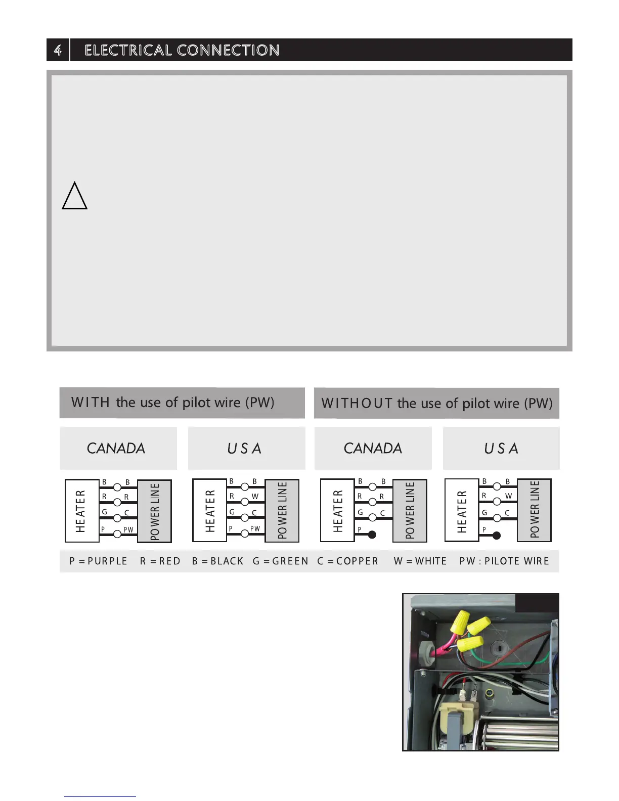 - You must connect the ground wire of the heater (green