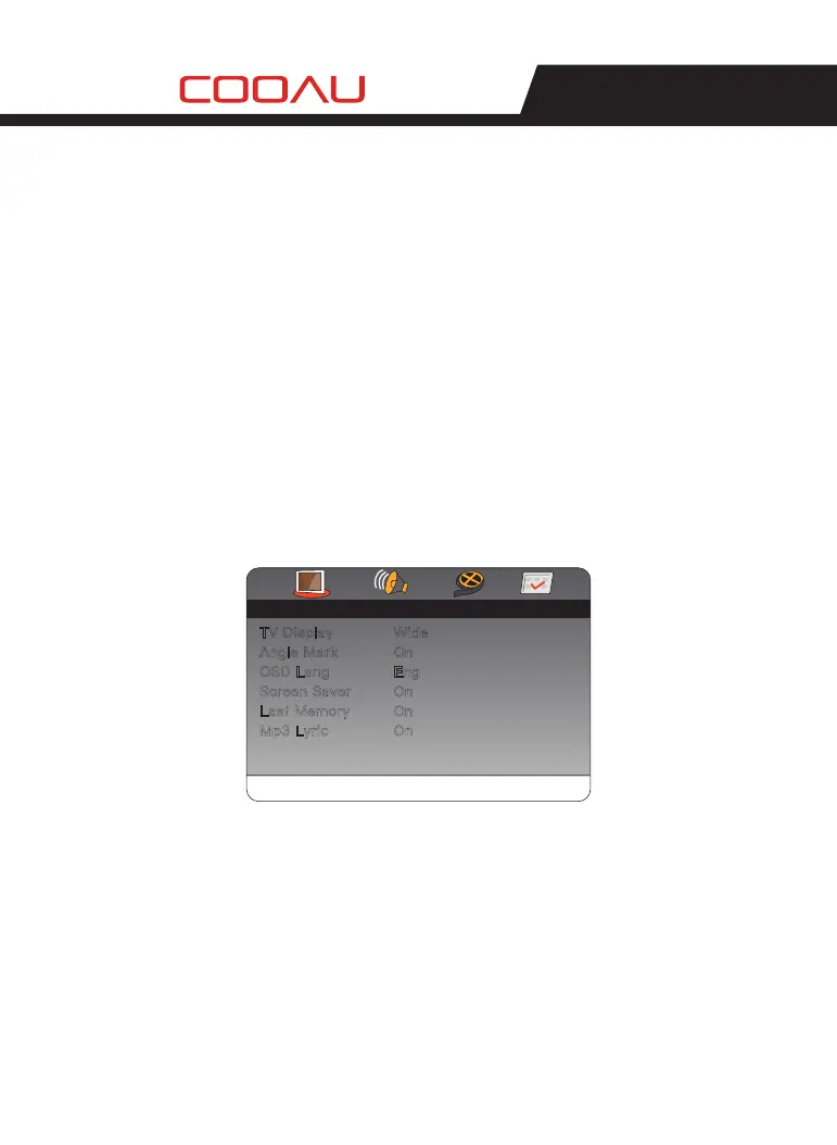 DISPLAY, ANGLE MARK, OSD LANGUAGE, SCREEN SAVER, LAST