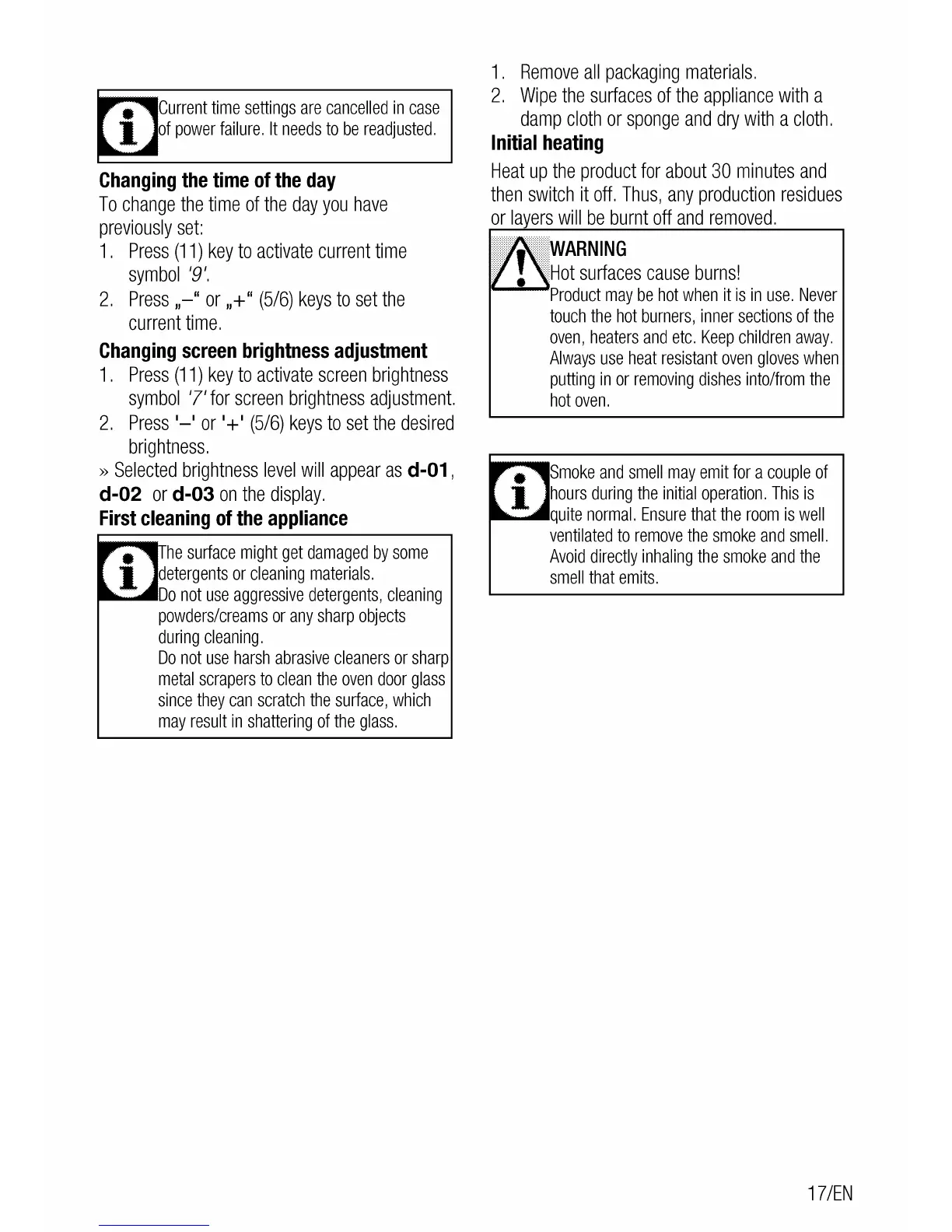 Cookmaster CK100C210 - Changing the Time of the Day; Changing Screen Brightness Adjustment; First Cleaning of the Appliance; Initial Heating