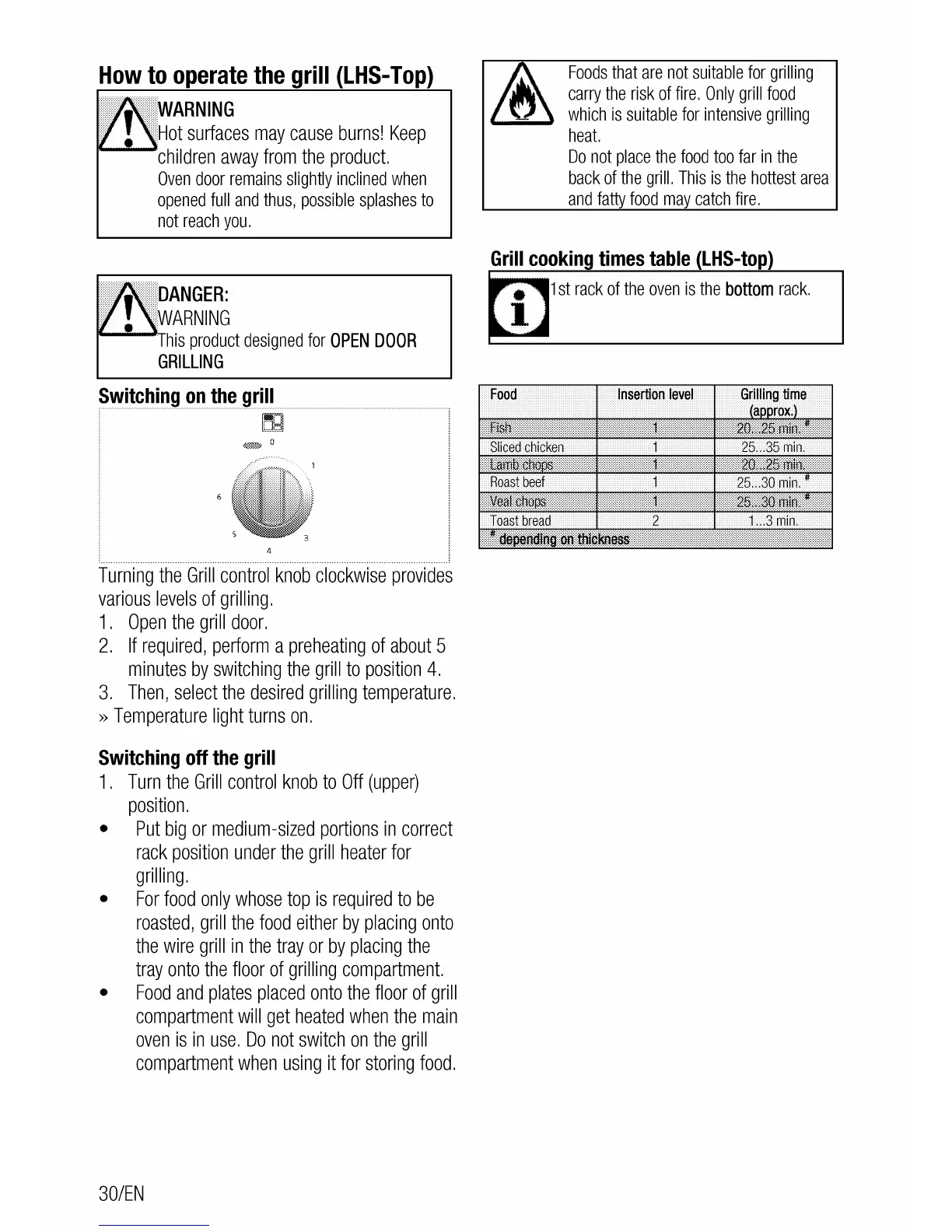 Cookmaster CK100F232 - LHS Top Grill Operation; Grill Operation and Safety; LHS Top Grill Cooking Times