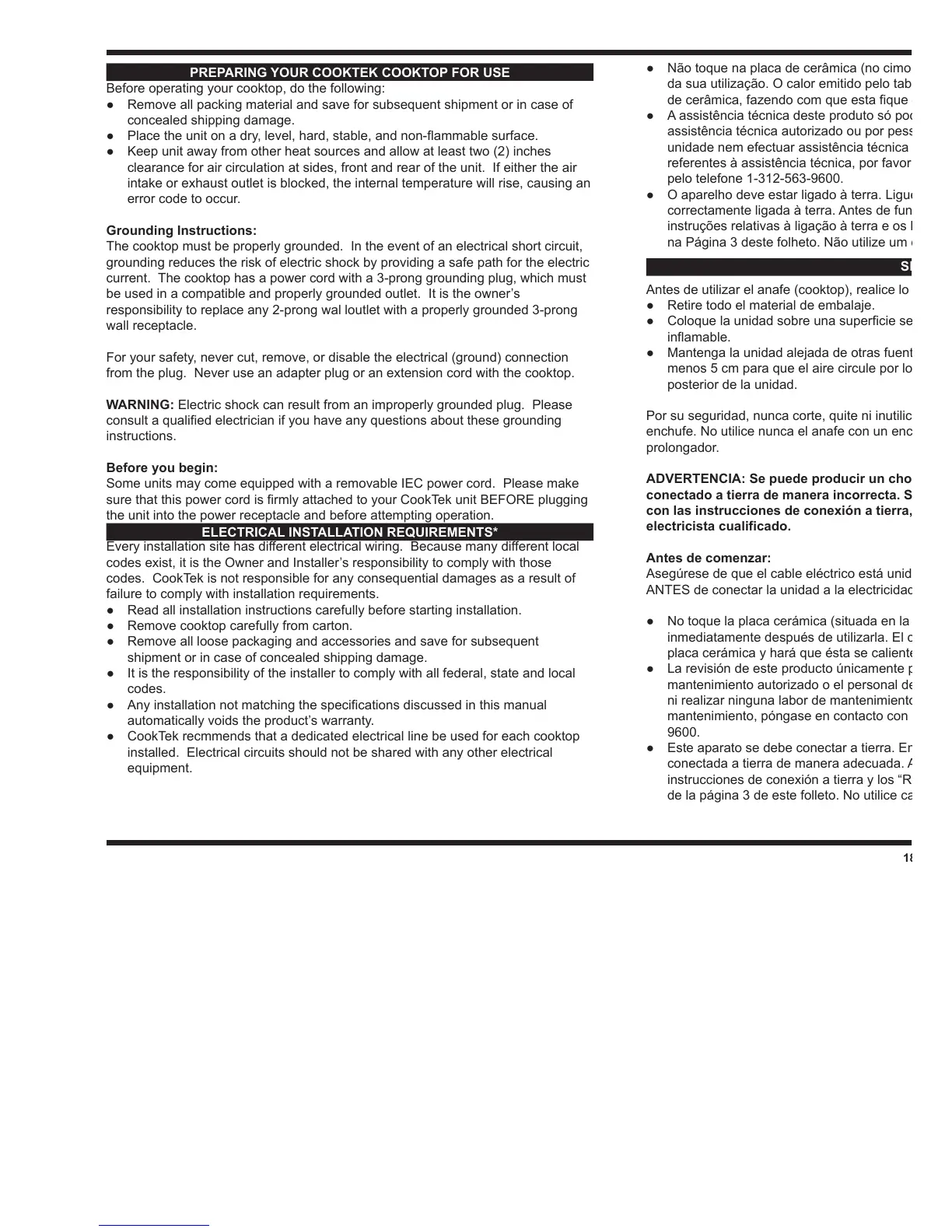 CookTek MC3502F - Preparing Your CookTek Cooktop for Use; Grounding Instructions; Before You Begin; Electrical Installation Requirements