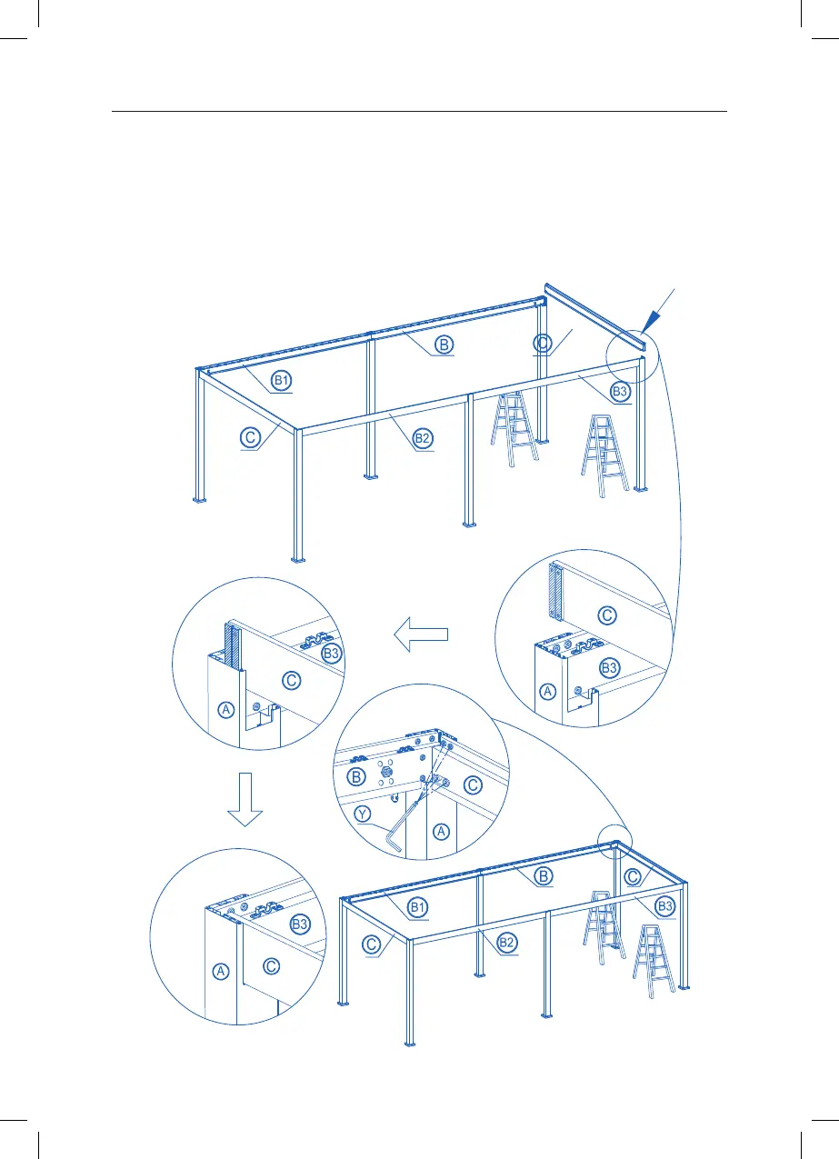 end beam (C) into the post (A) on the le and right side. Tighten screws with