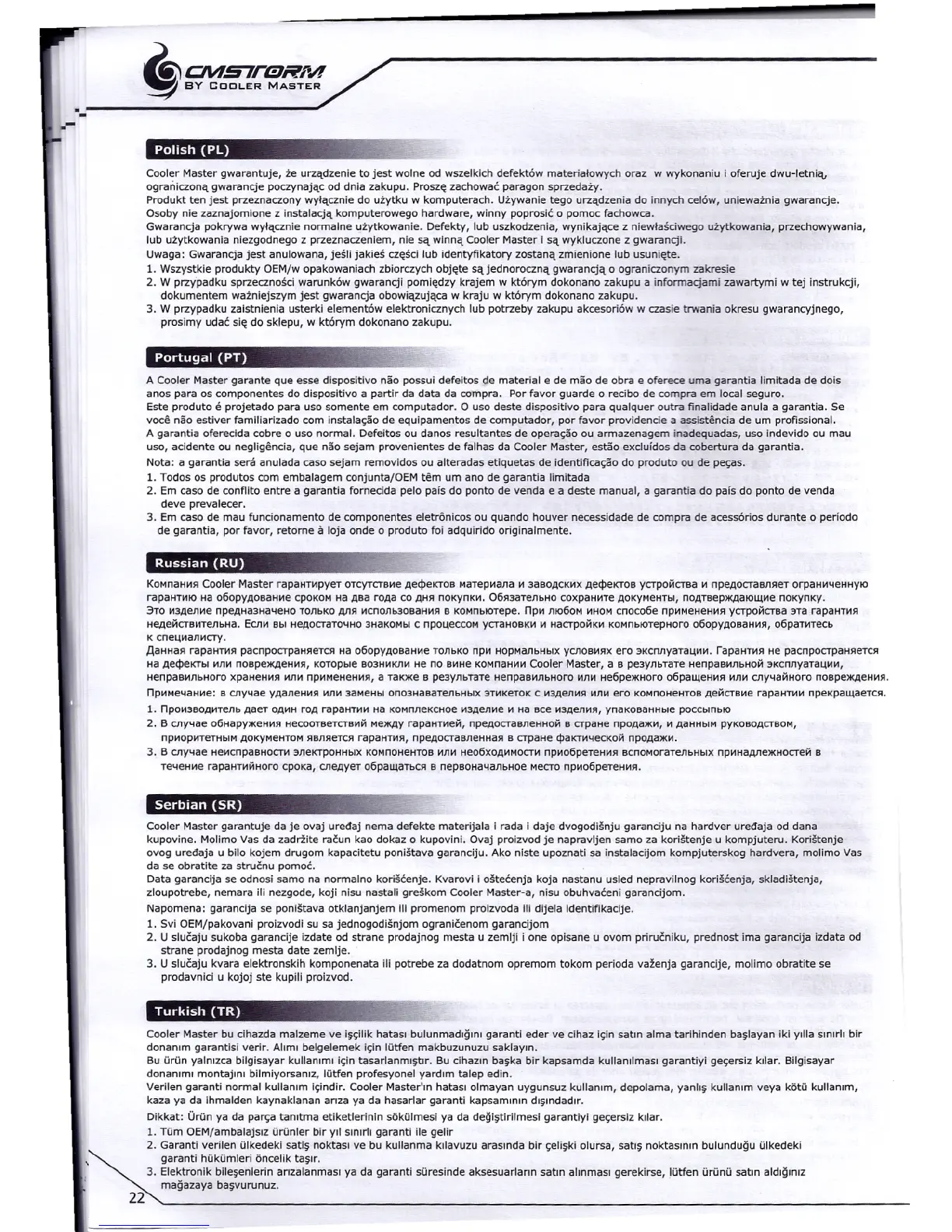 Cooler Master gwarantuje, ze urzadzente to jest wolne od wszelkich defektow materialowych oraz