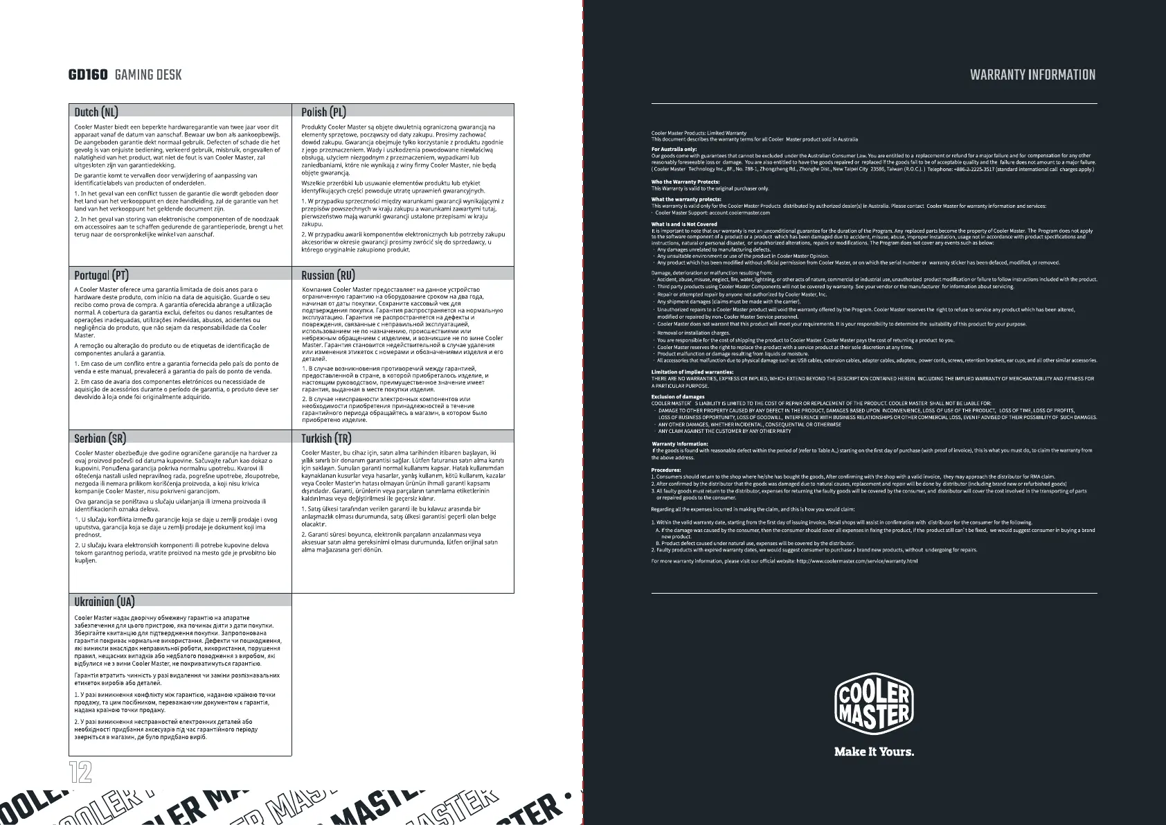 This warranty is valid only for the Cooler Master Products distributed by authorized dealer(s) inAustralia. Please contact Cooler Master for warranty information and services.