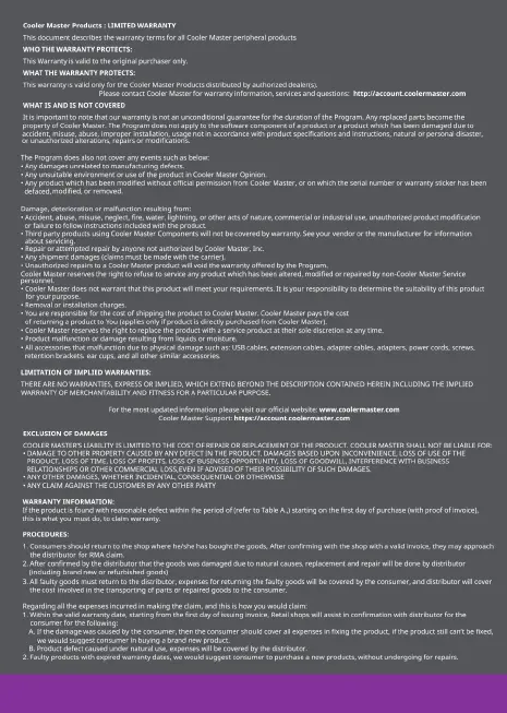 COOLER MASTERS Is 10 THE cosr REPAIR OR REPLACEMENT OF THE PRODUCT. COOLER MAsrERSHALL NOT BE FOR
