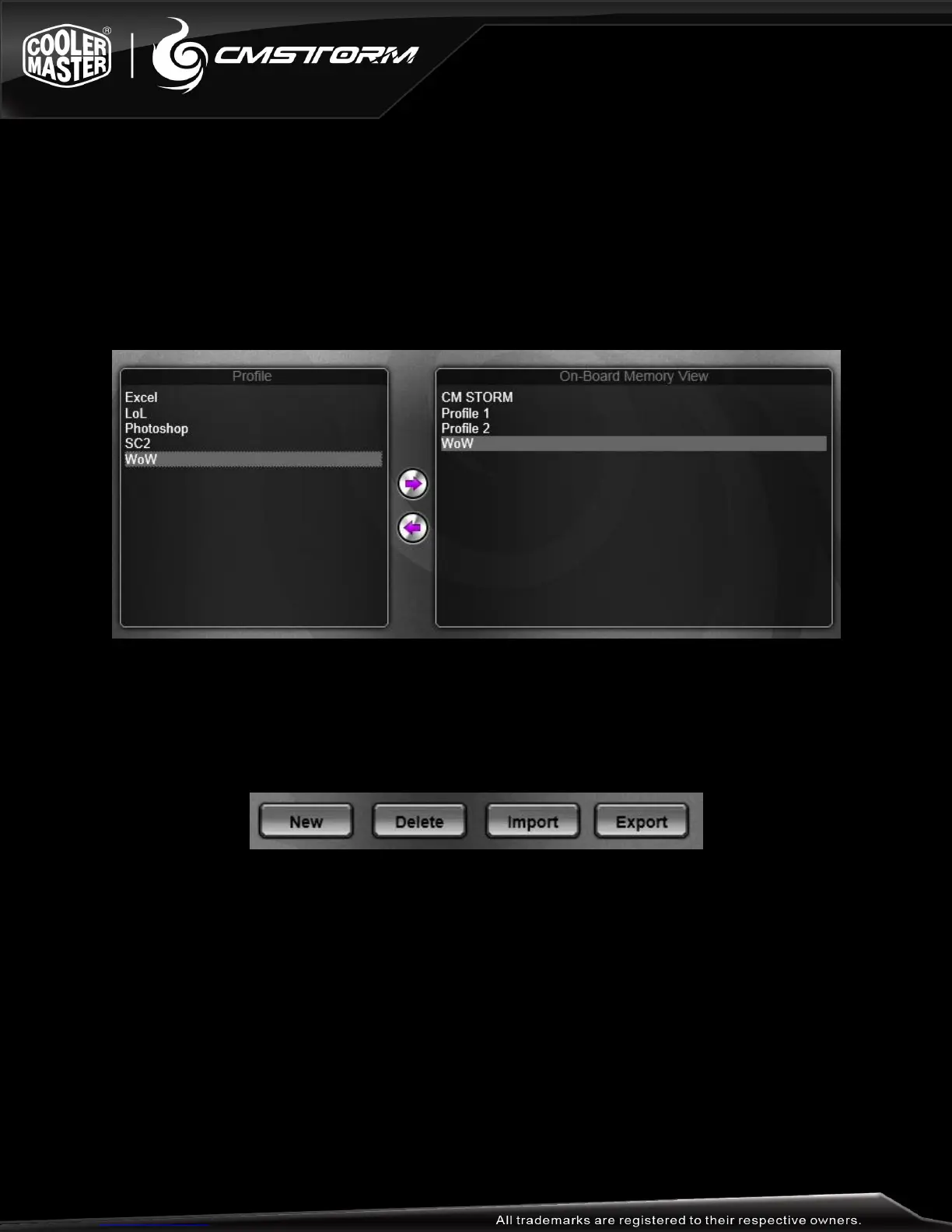 profiles loaded into the mouse. The arrows in the center control the import and export of
