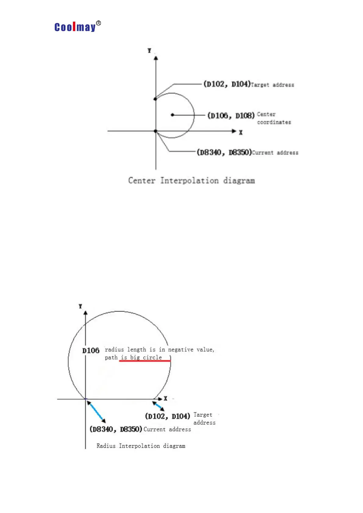 In the radius interpolation: D100 speed, D102 is the X-axis target address, D104 is the