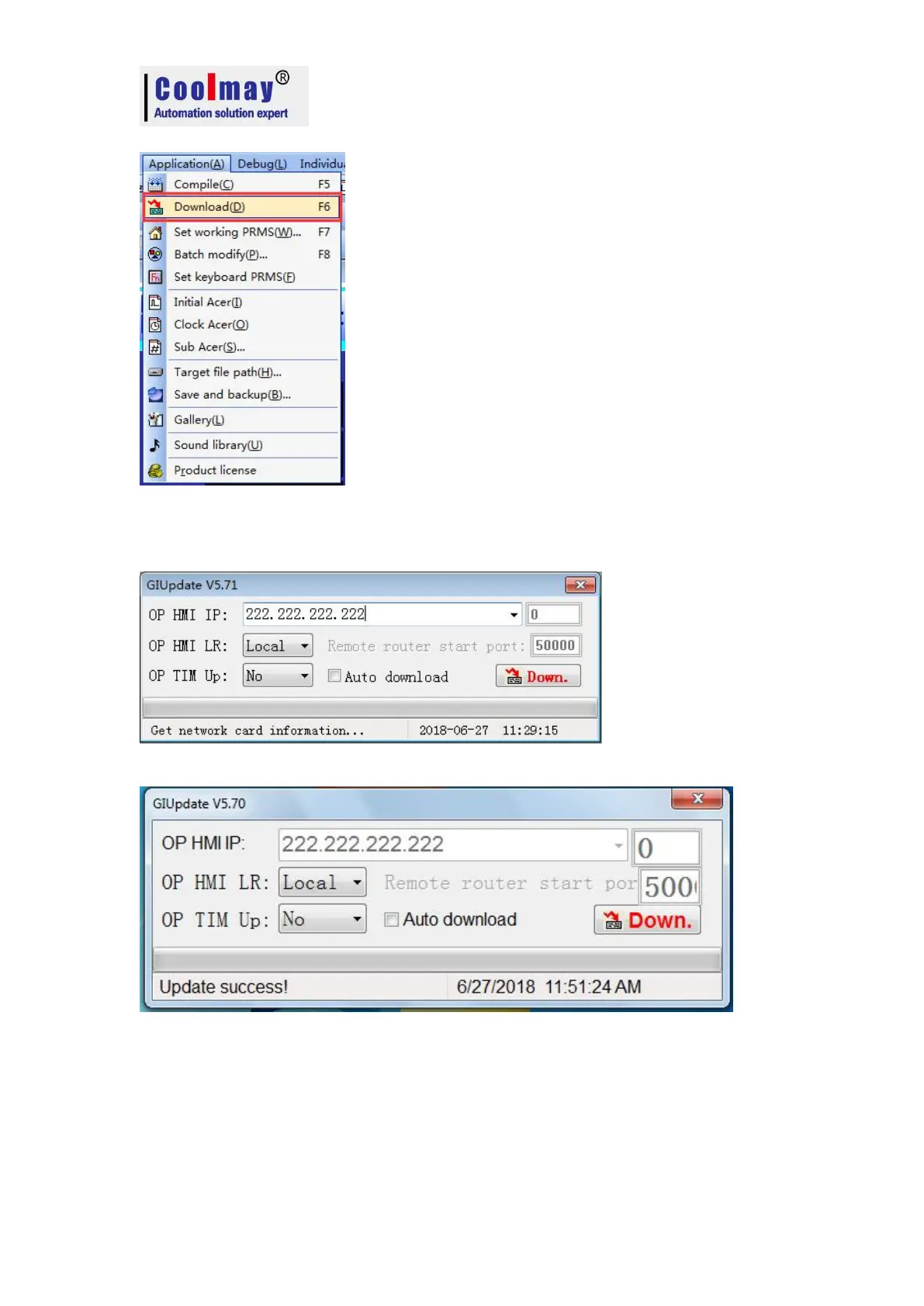 4.downloading window will appear,waiting until that HMI connection is ok,IP setting is OK,
