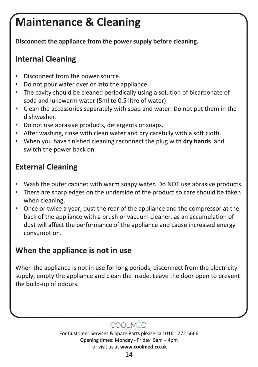 Coolmed CMS29 - Maintenance & Cleaning; Internal Cleaning; External Cleaning; When the appliance is not in use