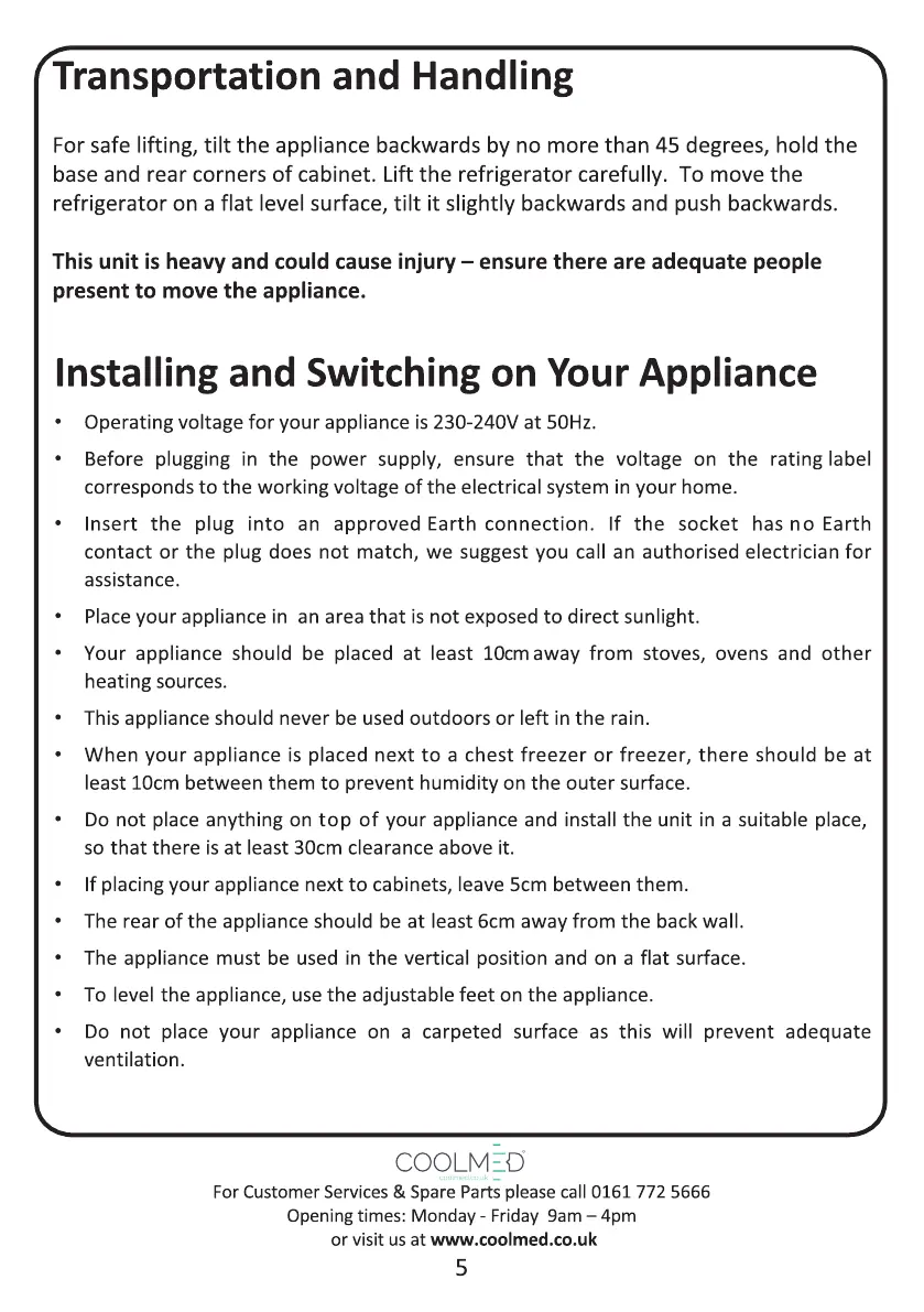 Coolmed CMS29 - Transportation and Handling; Installing and Switching on Your Appliance