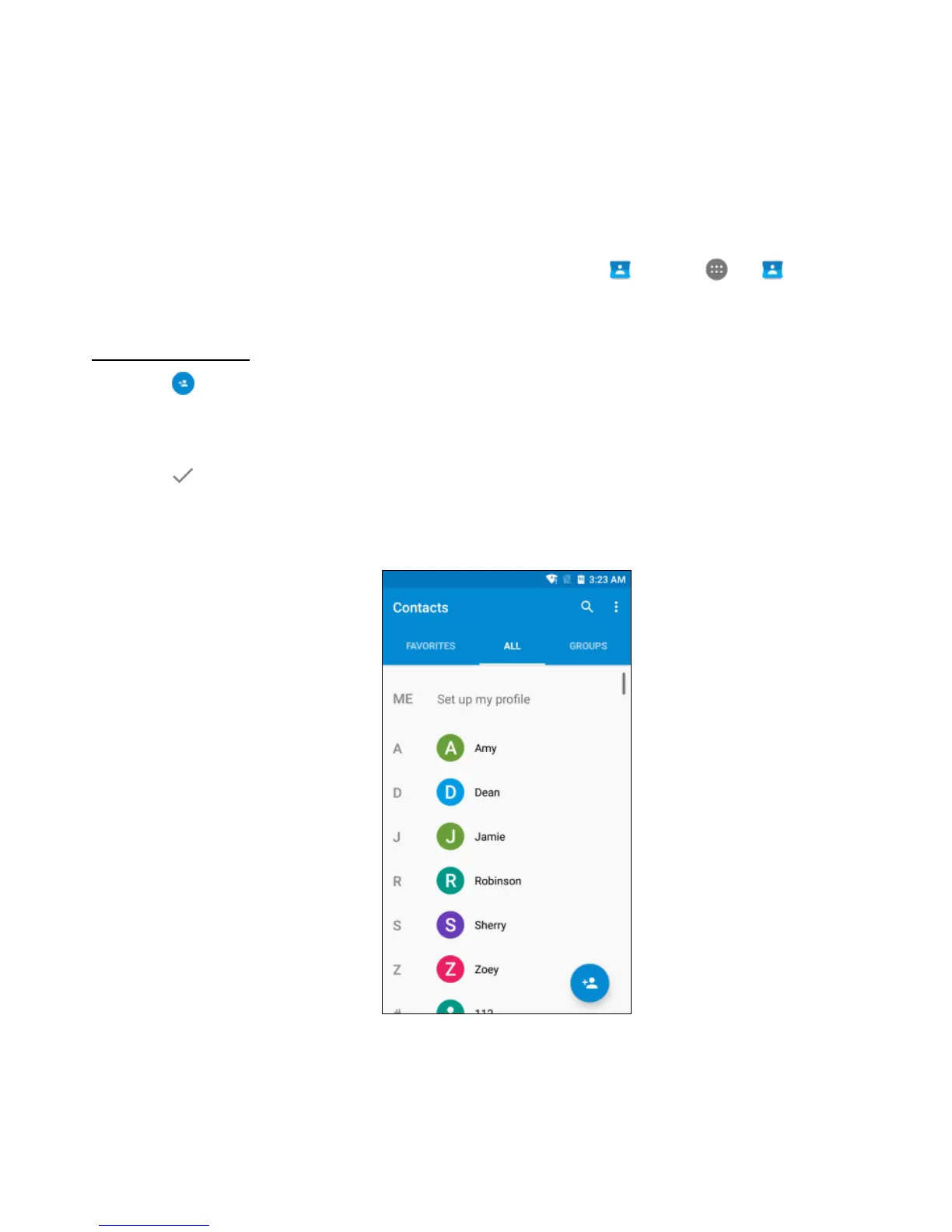 1. Tap at the lower right corner of the Contacts screen to add a new contact.