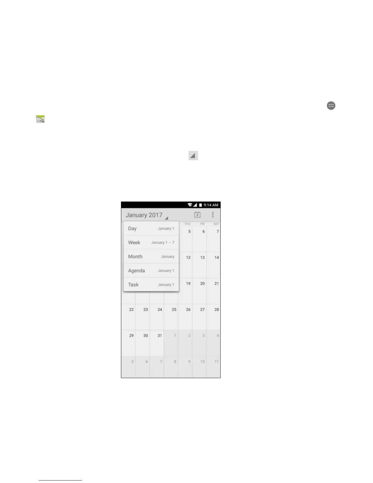 • To modify the Calendar view, tap and choose Day, Week, Month, Agenda or