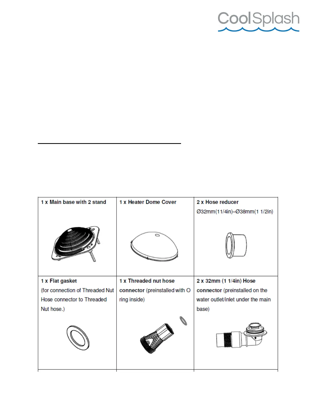 Before installing CoolSplash Solar Heater, check to make sure all parts are present