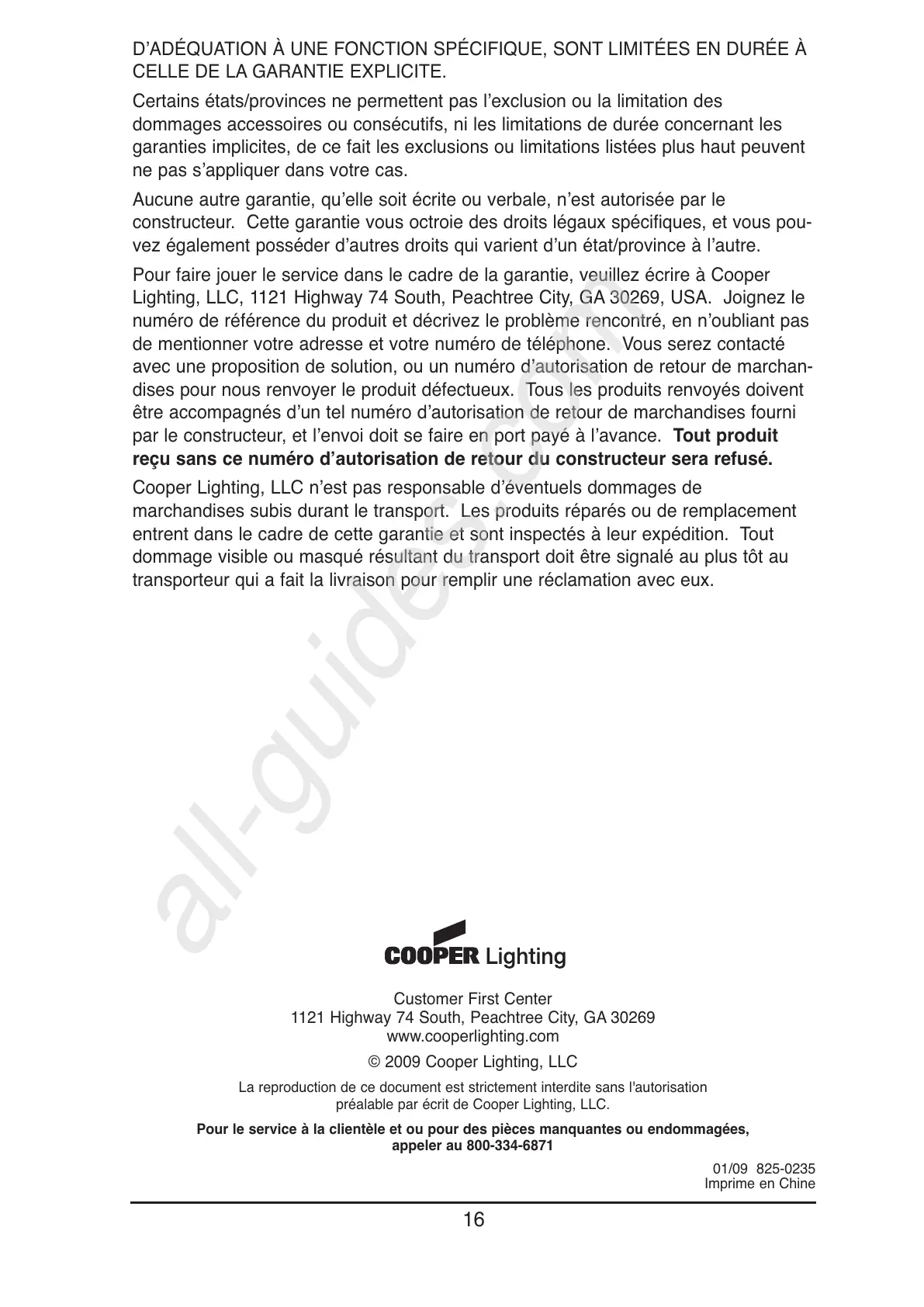 Pour faire jouer le service dans le cadre de la garantie, veuillez écrire à Cooper