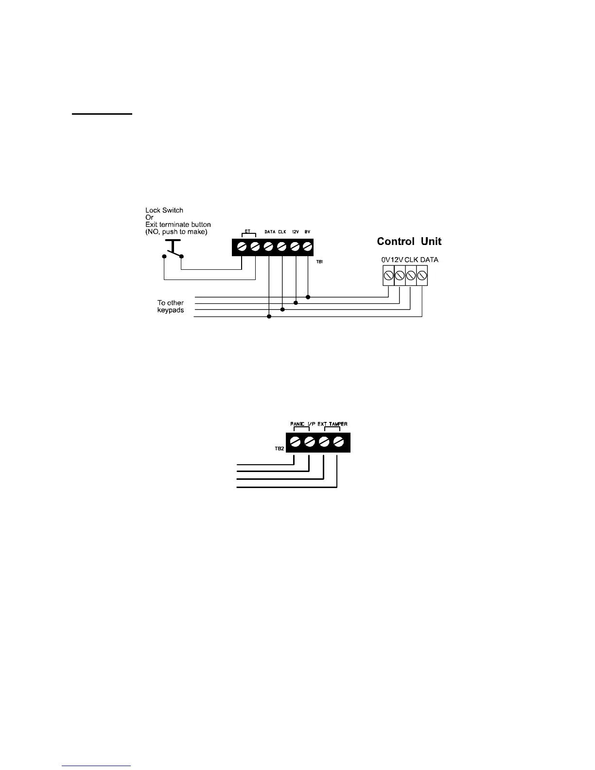 terminals on the keypad PCB to connect an exit terminate button or lock