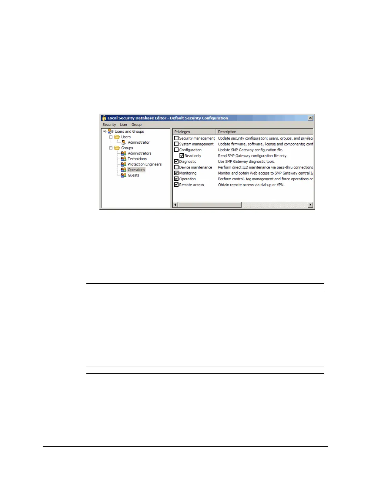 The Local Security Database Editor window appears. If you click a user group in the left pane,