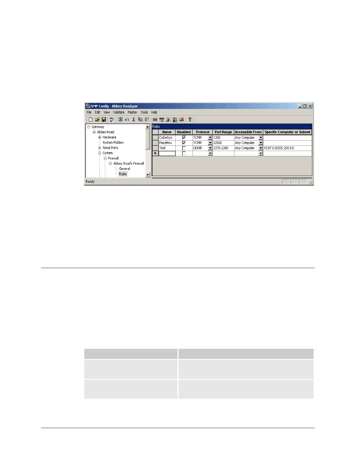 In the following illustration, the rule “Test” opens ports 2270 to 2280 to UDP messages. It is