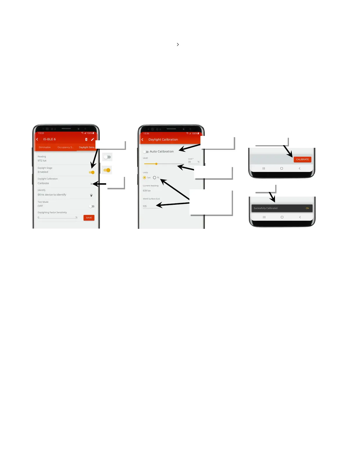 7: Tap the calibrate button. A message will briefly be shown at the bottom of the display to indicate a successful transmission indicating that