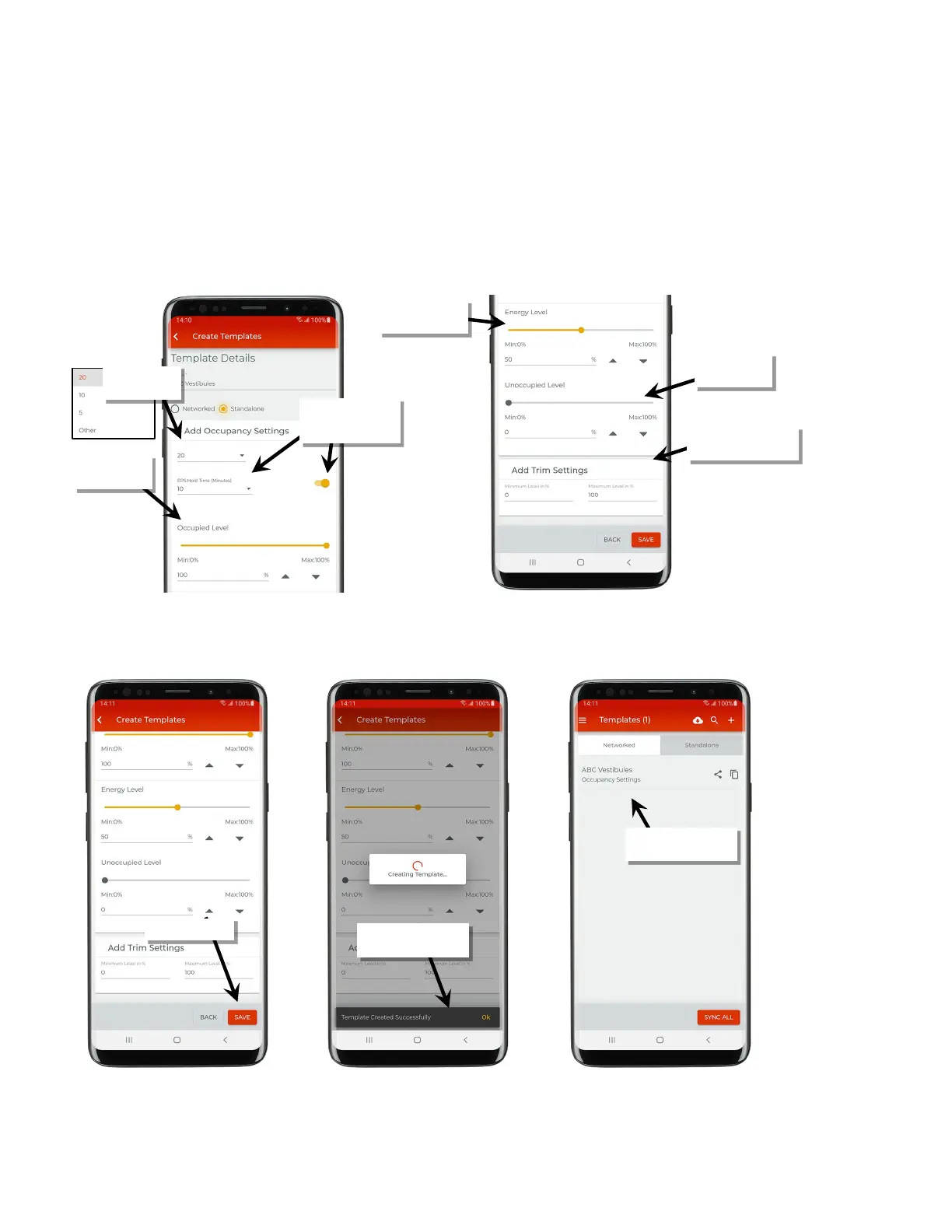 5: Next, set the default device occupancy settings. Select the desired hold time and then enable/disable and configure energy saver mode.