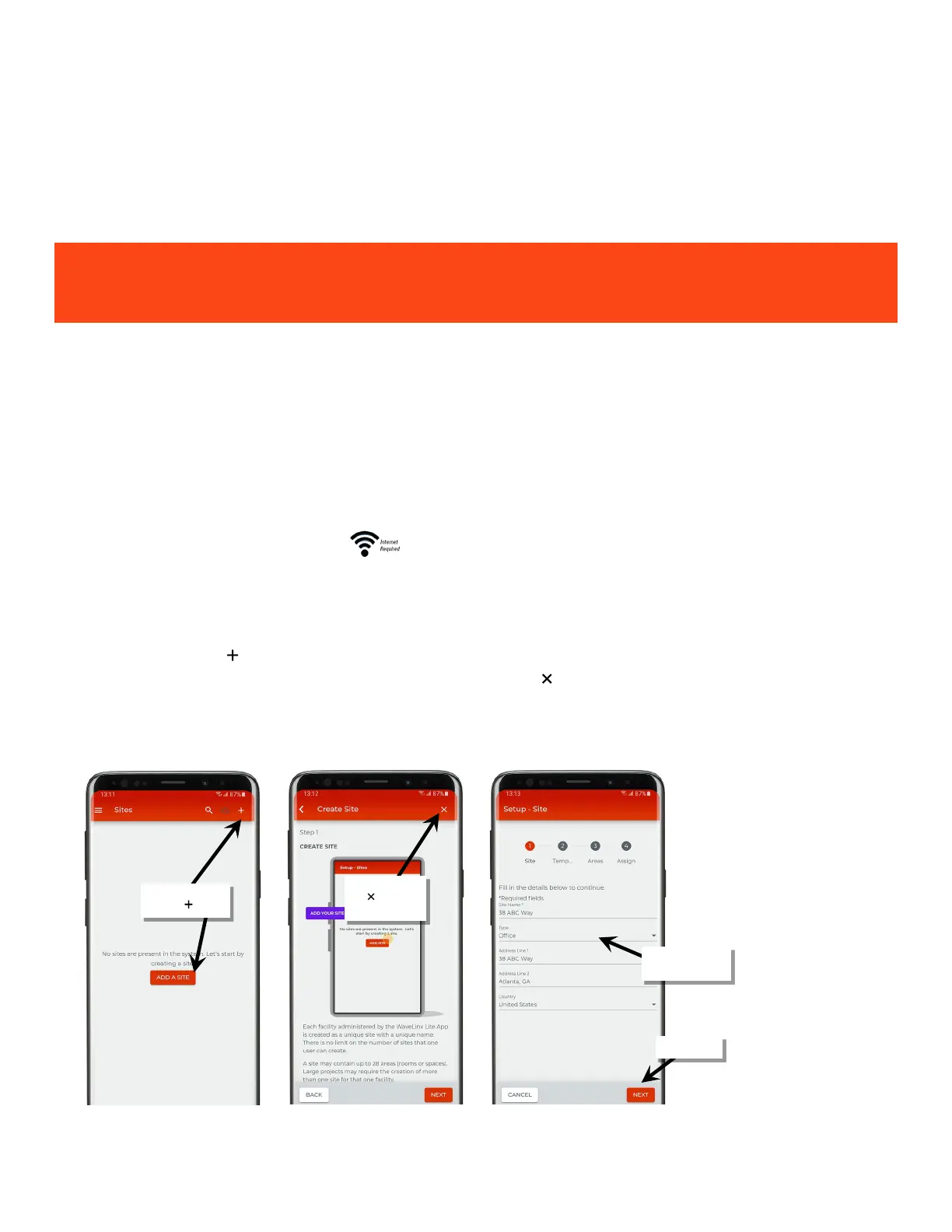 To use the site setup wizard, there must be an internet connection as well as Bluetooth access between mobile device and the WaveLinx Lite