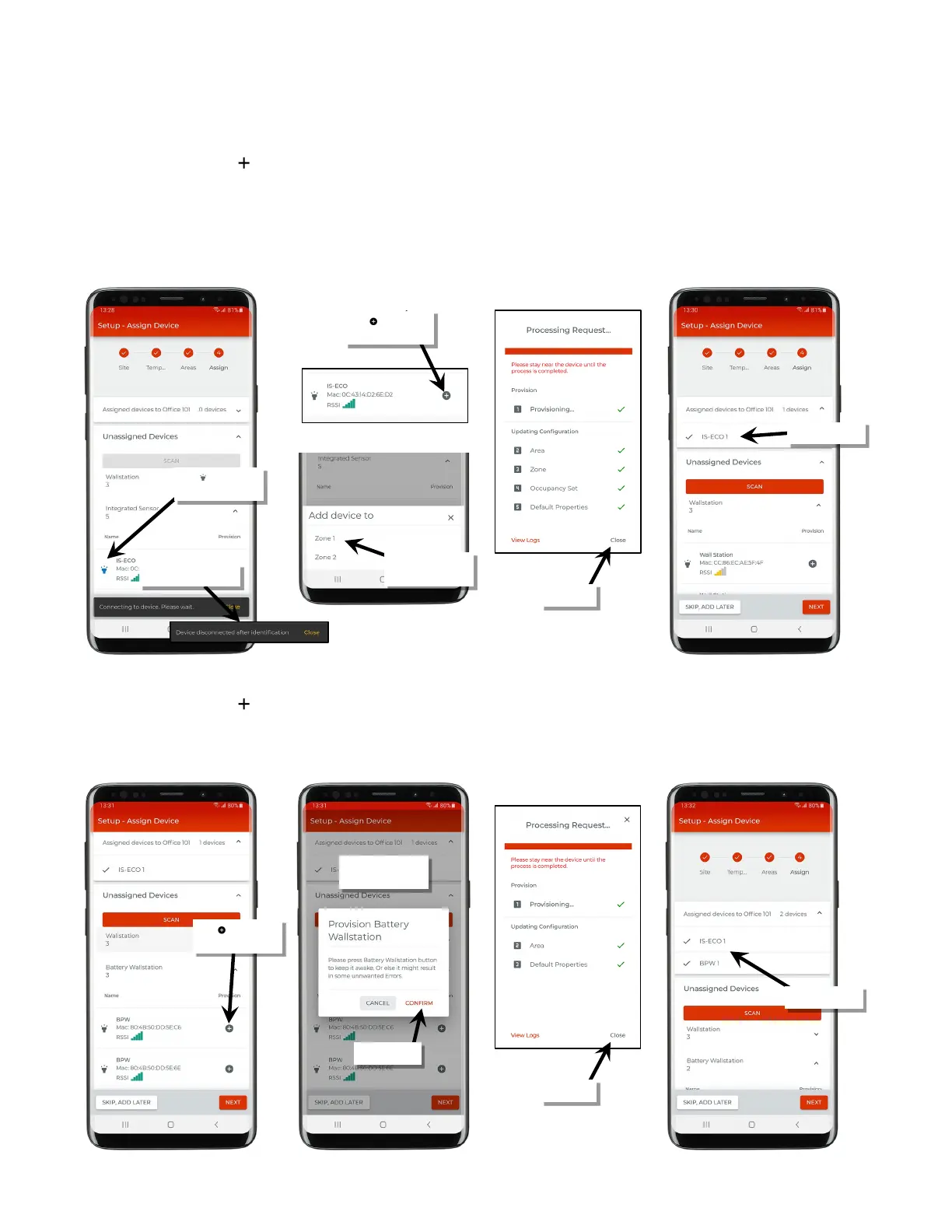 Staying near the device, tap ‘ ’ on the identified device to begin the provisioning process. When prompted, press any button on the station to
