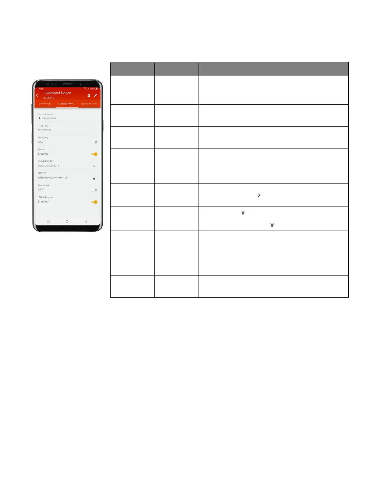 7: Tap on the device to open the ‘Device Details’, and then tap ‘Occupancy Sensor’. Refer to the chart for information on the items shown.