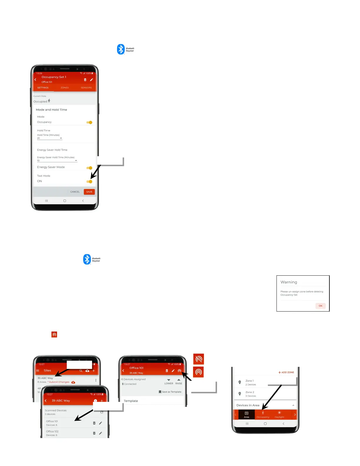 An occupancy set can be deleted ONLY if there are no zones assigned to it. The mobile application will block