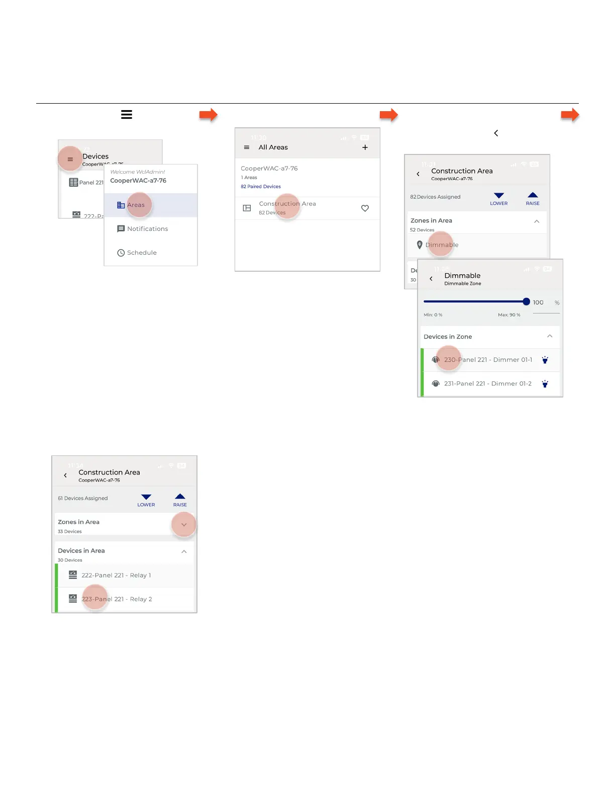 Area. Tap a dimmer to view it.