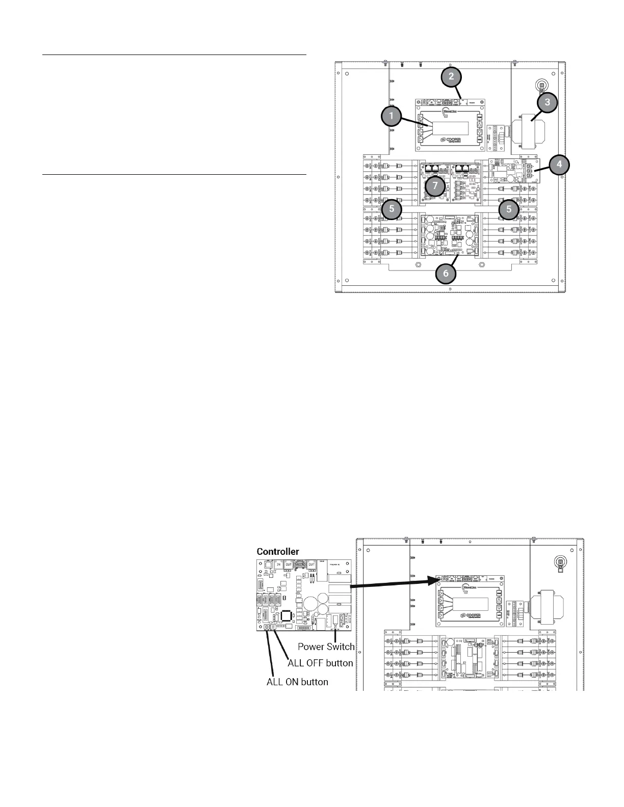 Once power is applied, the relay override buttons and display allow manual operation of the relays and dimmers until a connection can