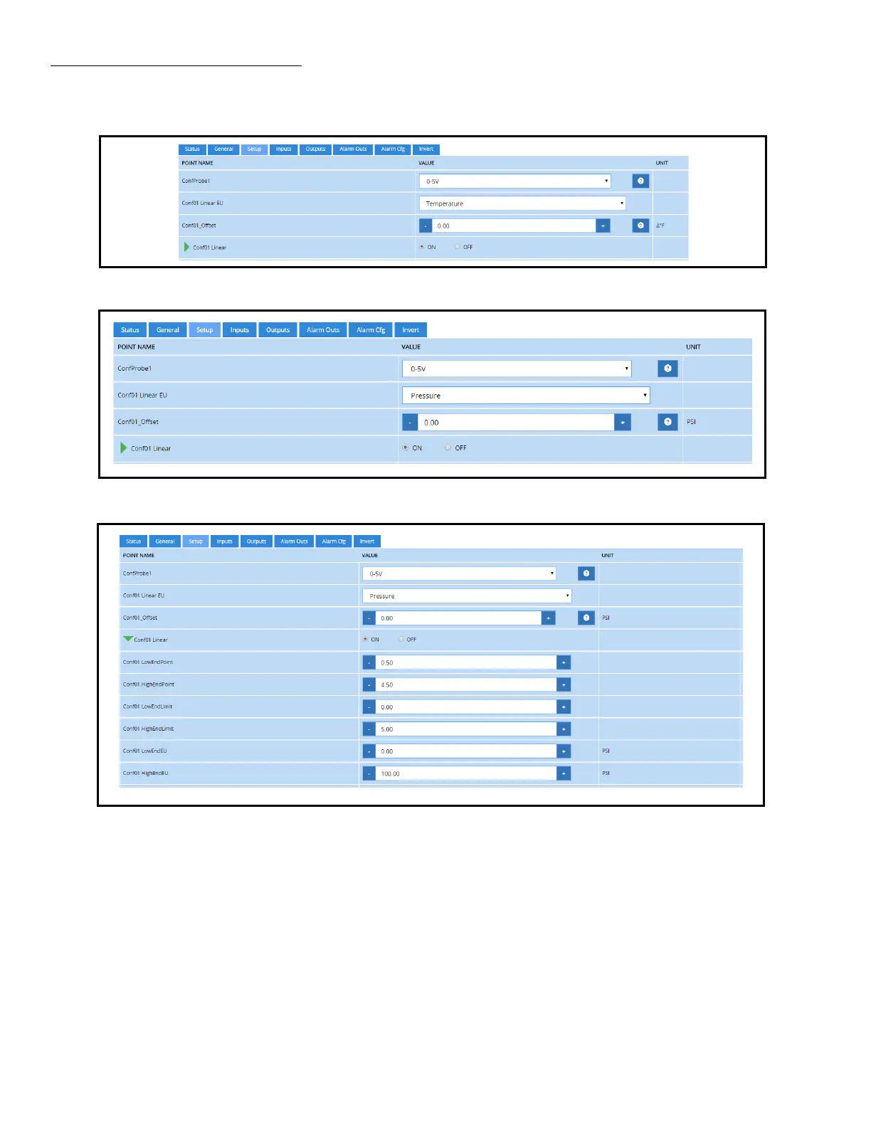 1. Configure ConfProbeX to 0 - 5V and Set ConfX Linear to On. Press Save.