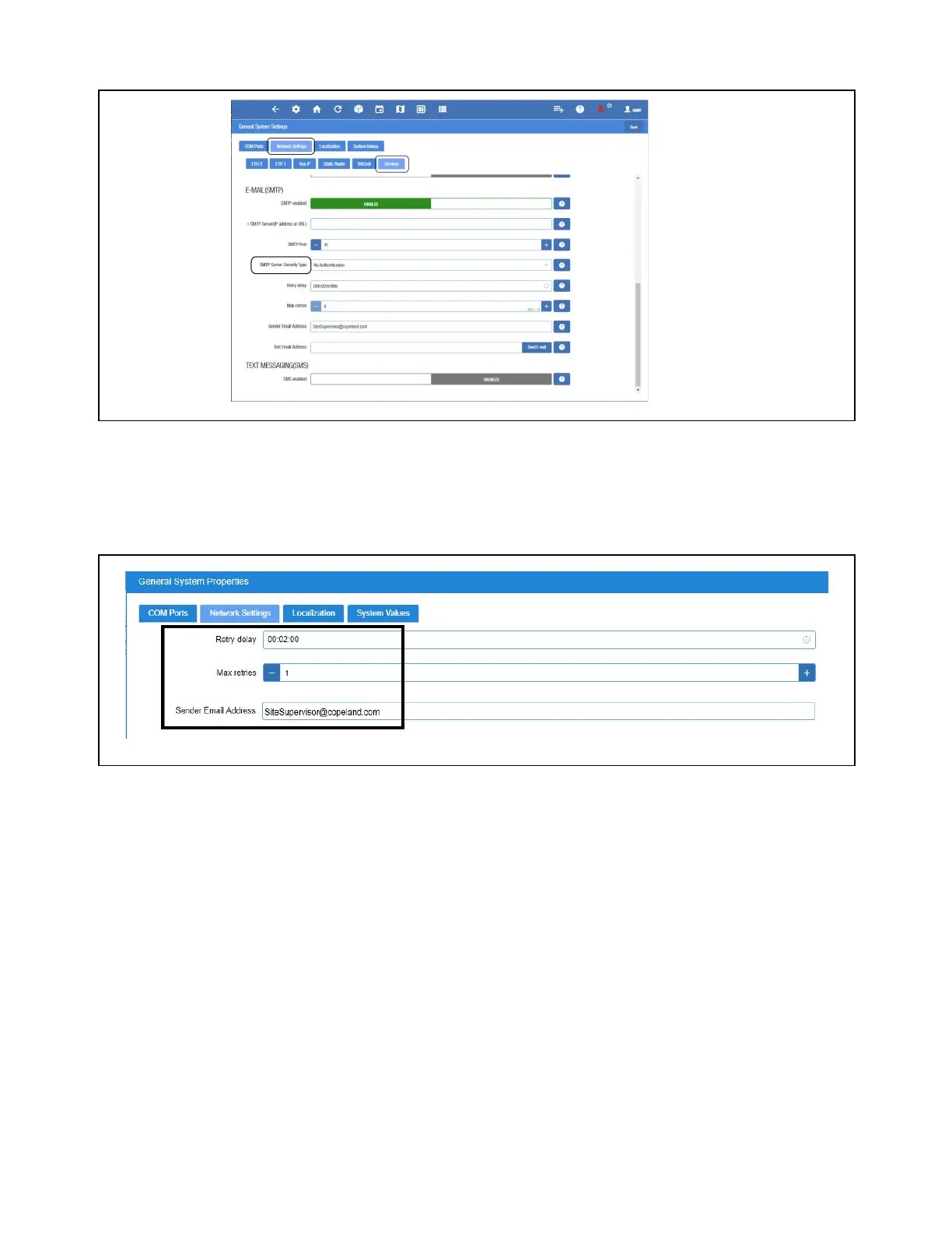 • Sender Email address - Set the email address the Supervisory Controller will use to send Alarm Communications.
