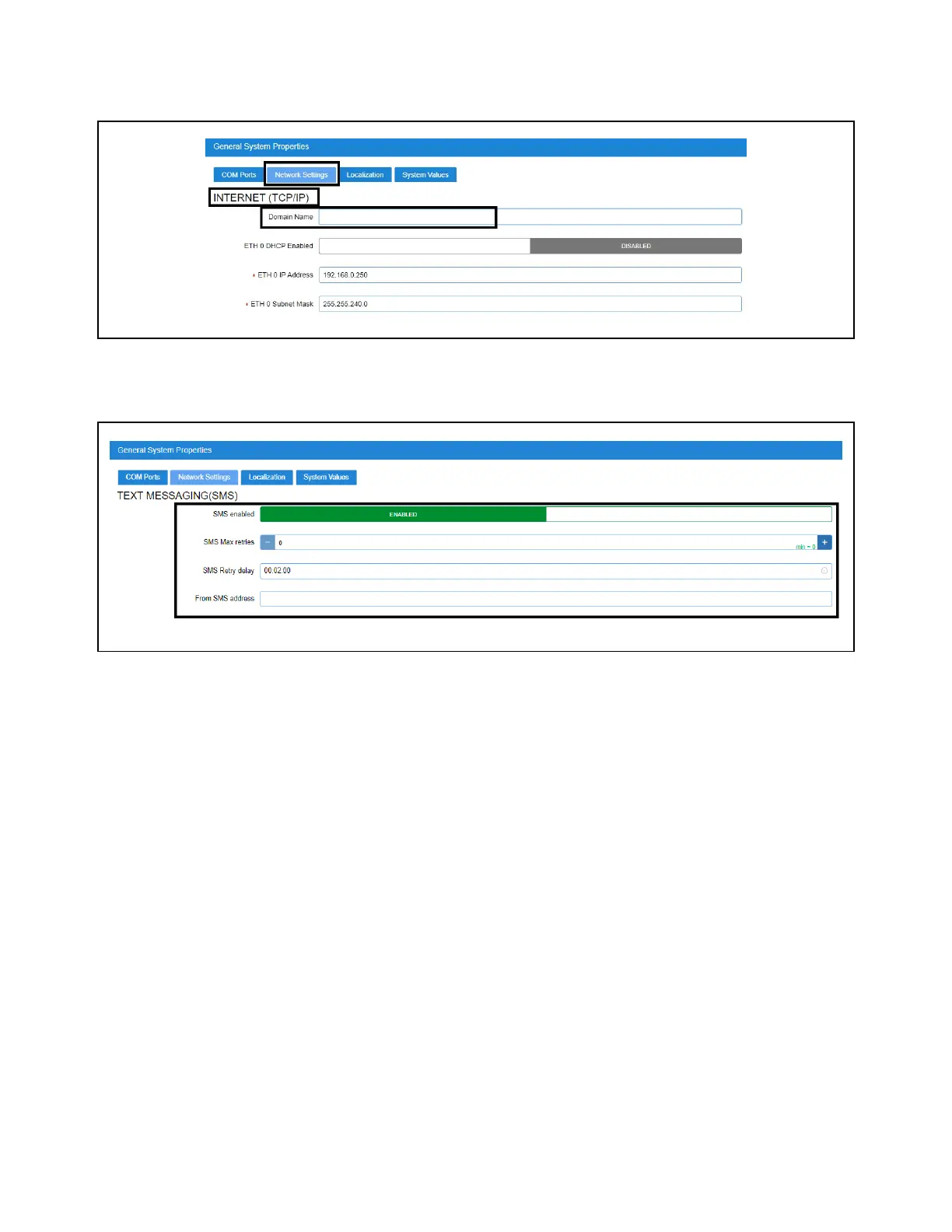• SMS enabled - Enables or disables the SMS network setup. SMS support must be ENABLED.