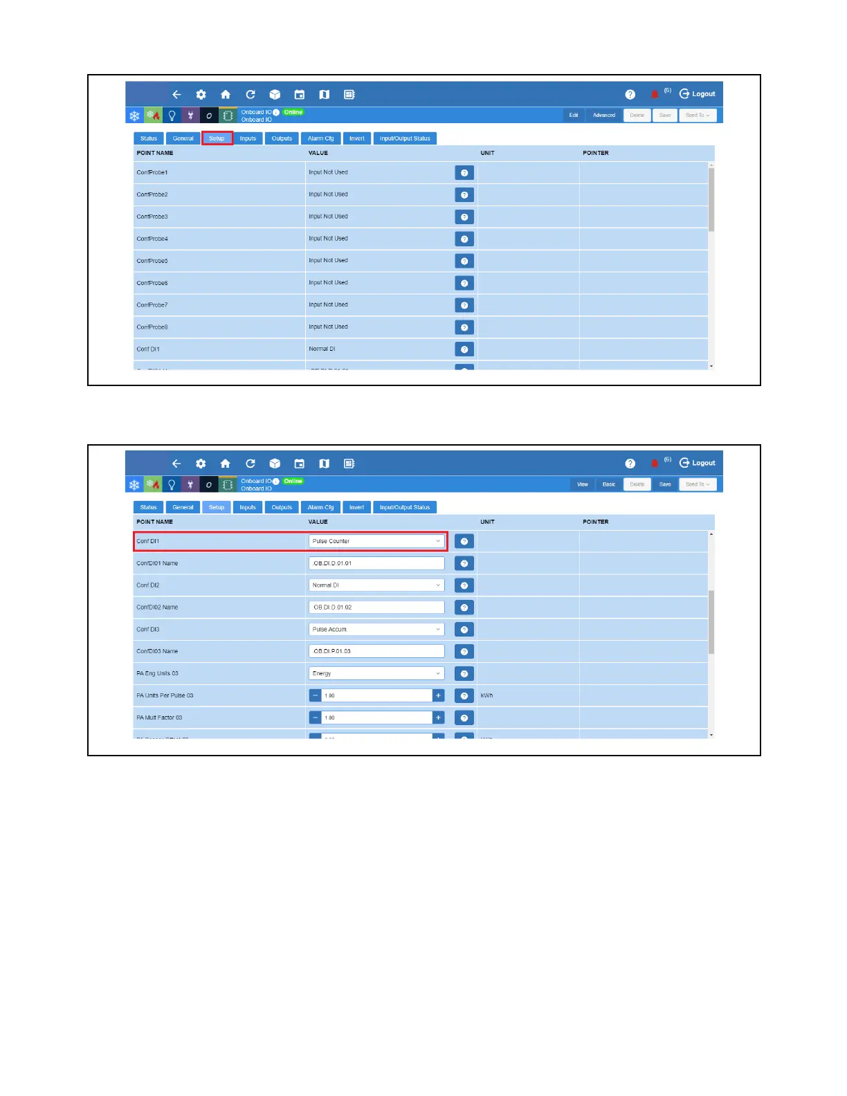 4. Scroll down to Conf DI1, select Pulse Counter and click Save.