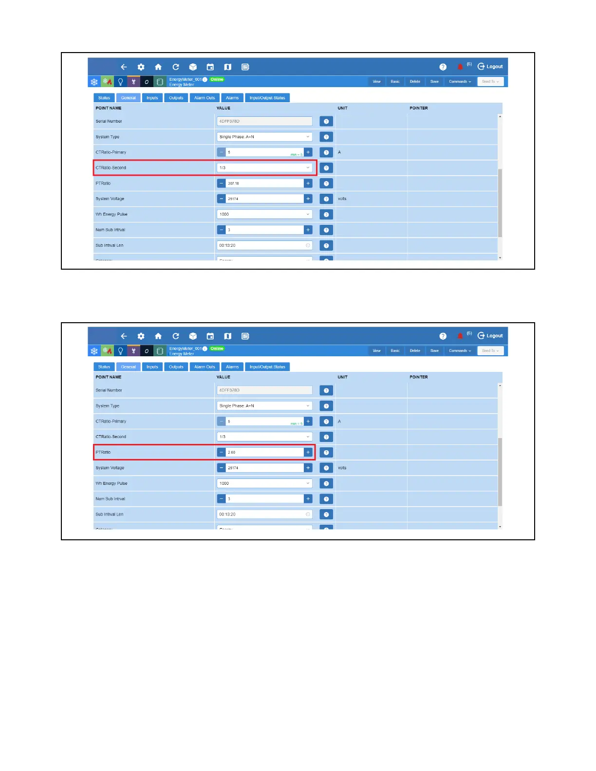 7. Set up the PTRatio. The meter scales this value by 100 (example, entering 200 yields a potential transformer ratio of 2:1).