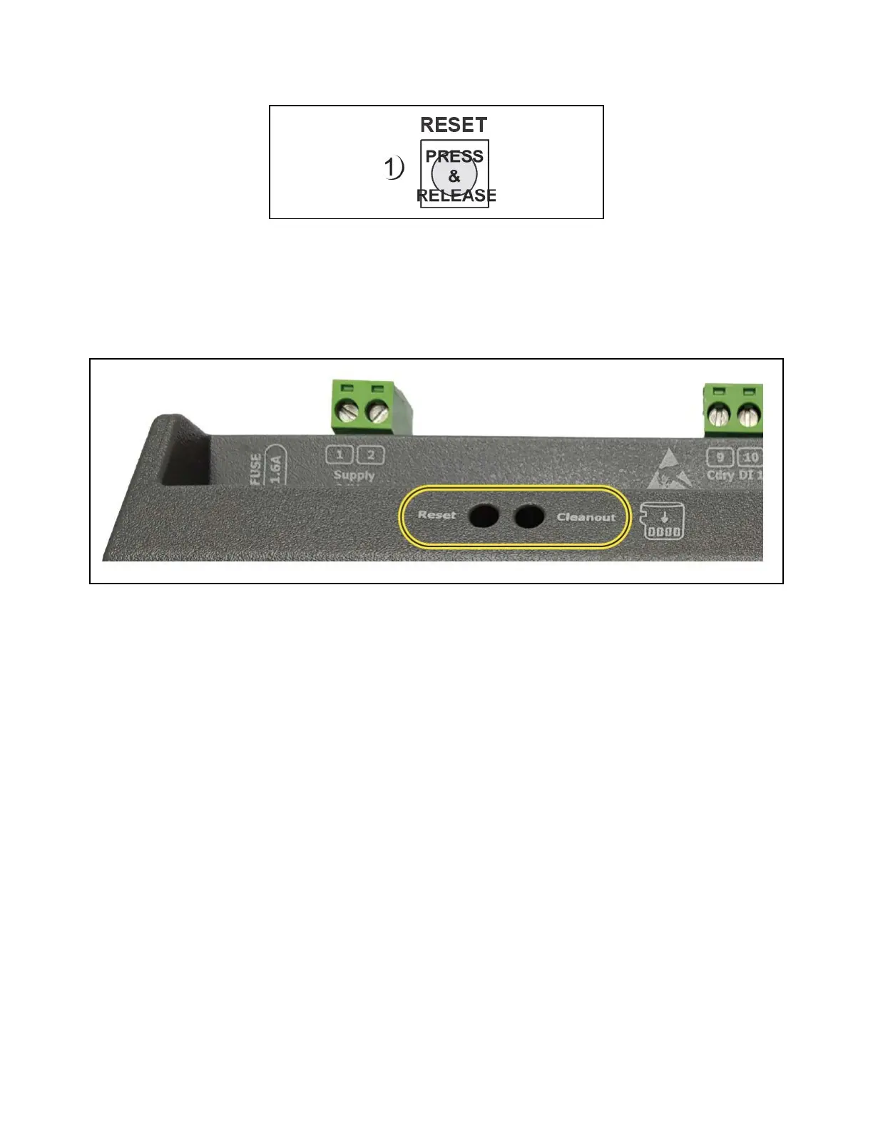 2. Use a small screwdriver or other instrument to access the Reset and Cleanout buttons by inserting into the access holes.