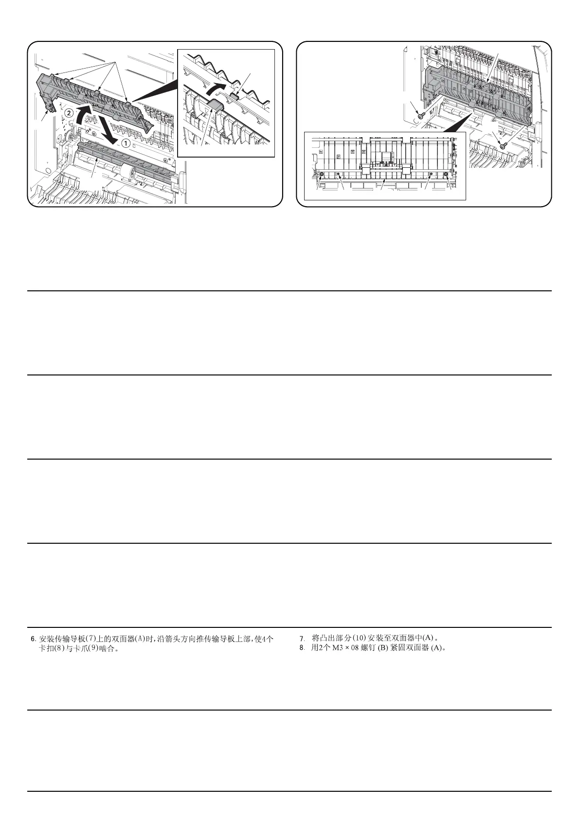 8. Secure the duplex unit (A) with two M3 x 08 screws (B).