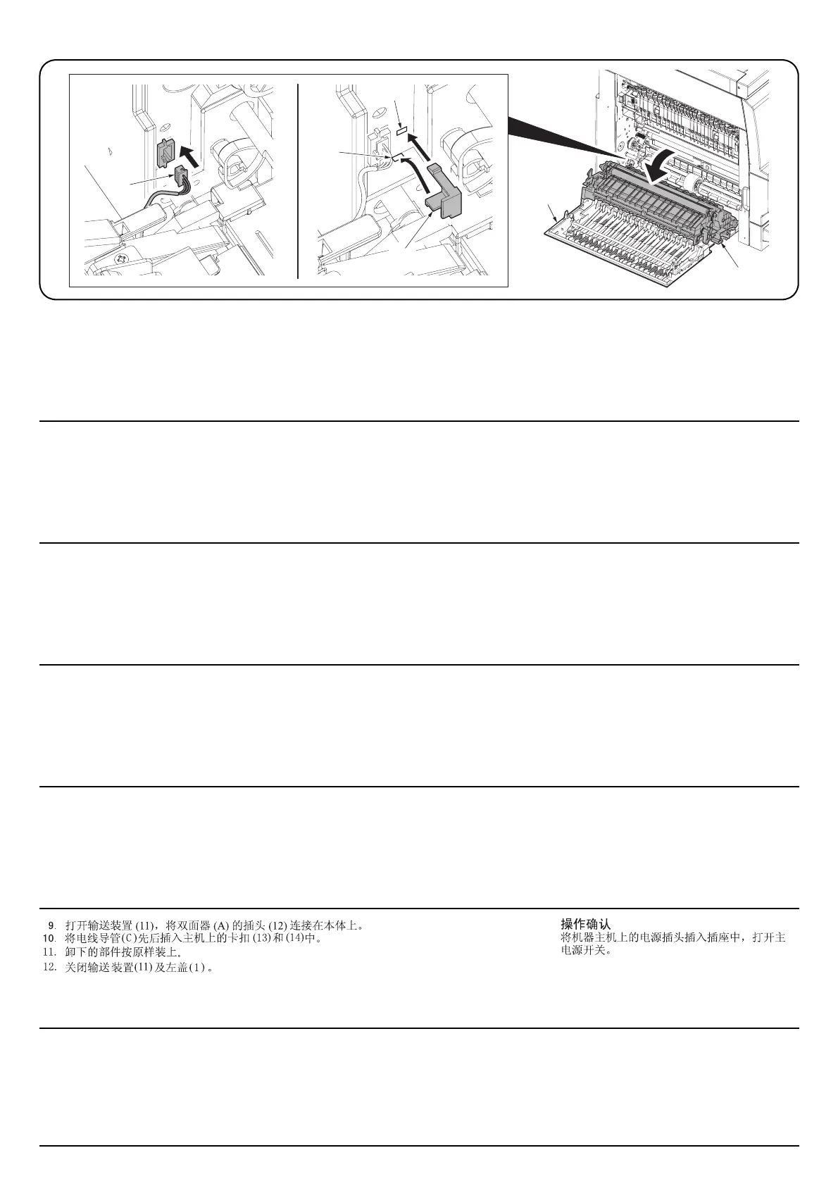 9. Open the conveyer unit (11) and connect the connector (12) of the duplex unit (A) to the main