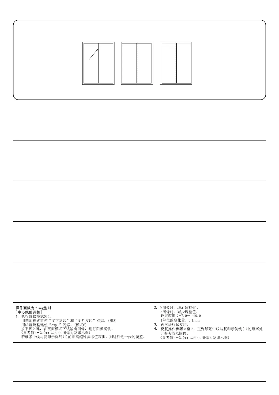 紙のセンター(破線)とコピーサンプルの線 (2) のずれが基準値外の場合は、次の