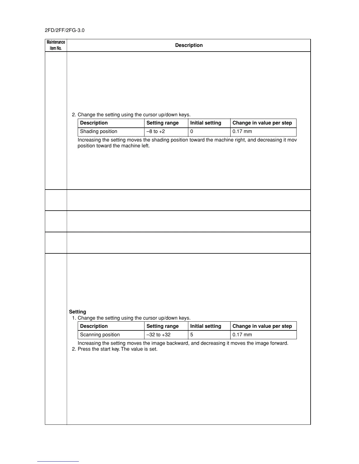 Increasing the setting moves the shading position toward the machine right, and decreasing it moves the