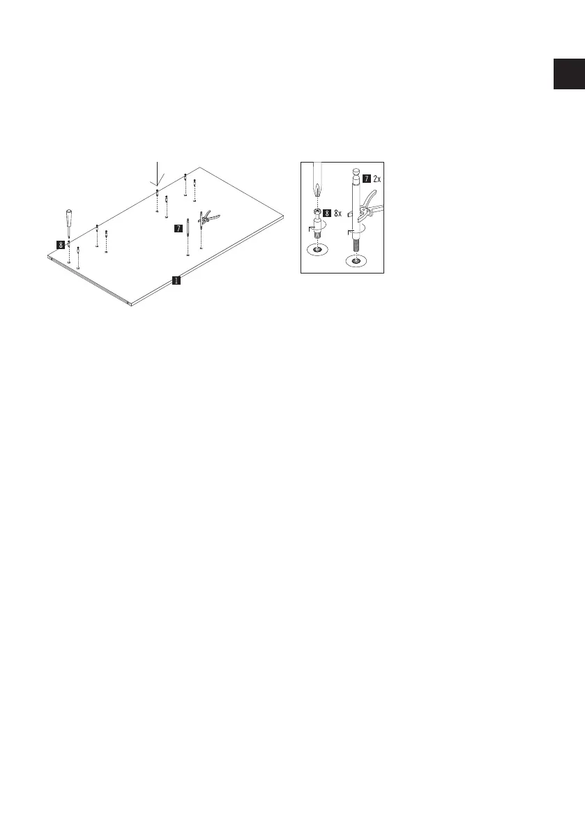 First, screw the 2 shelf bolts (part 7) into the