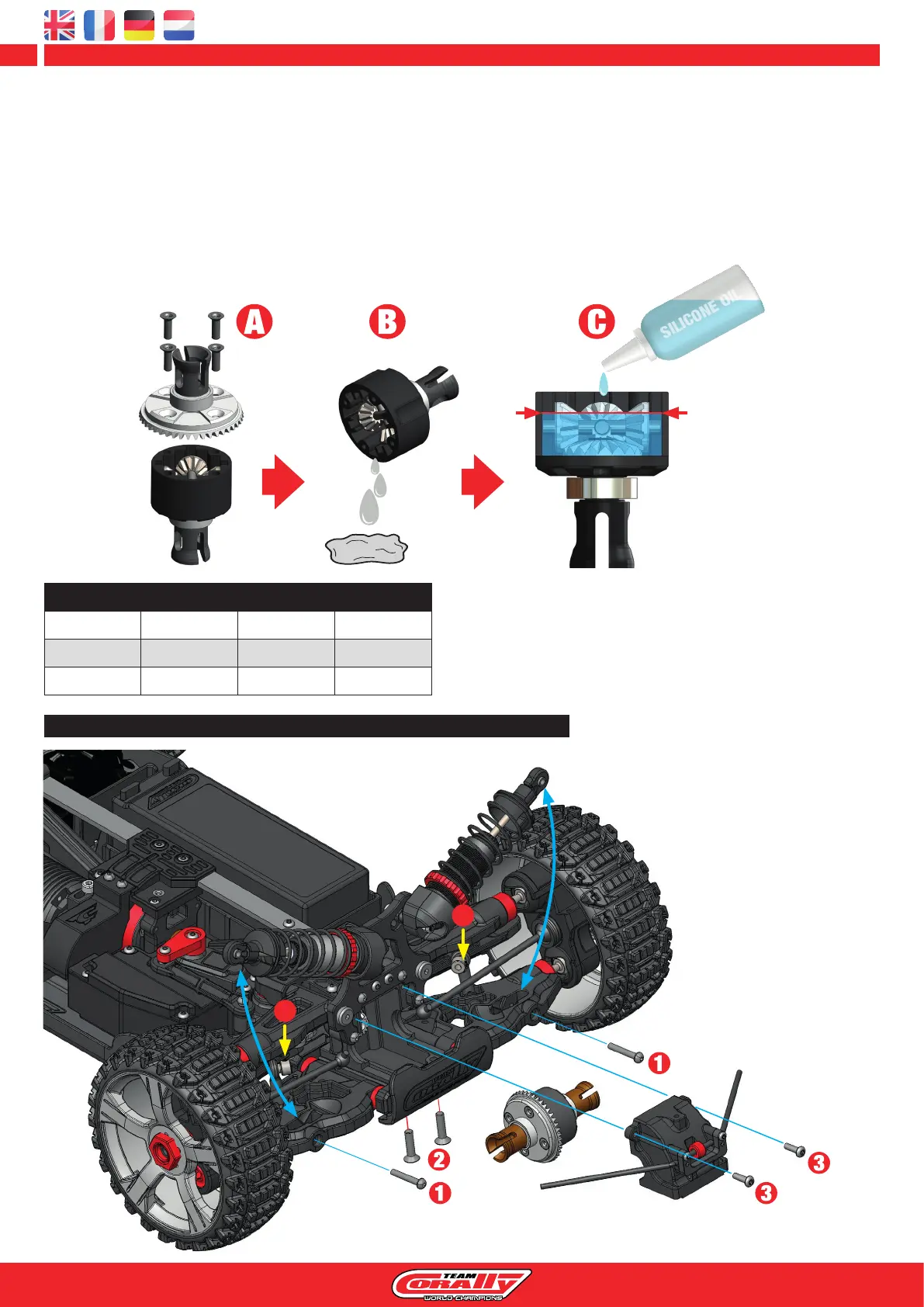 • It may be necessary to replace the silicone oil every 50 runs (depends on how you drive and the type of terrain you drive on).